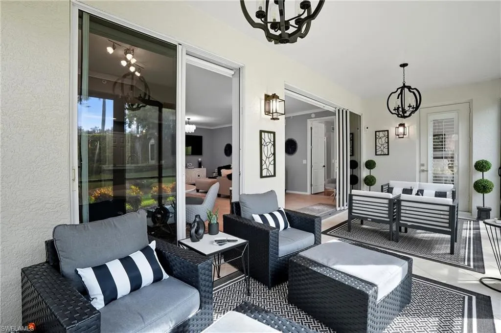 Rarely available, this exquisite residence at 10020 Valiant Ct #102 offers the epitome of luxury living within the main gates of Miromar Lakes. A meticulously updated 1st floor gem features IMPACT GLASS WINDOWS AND SLIDER! Offering 1,654 sq. ft. of modern luxury, this 3-bedroom, 2-bath home (den functions as 3rd bedroom) showcases refined elegance. This stunning home is a true rarity featuring several premium upgrades including $30K impact glass sliders and $20K impact windows ensuring both superior protection and undeniable value— These high-end features not only enhance the homes aesthetic appeal but also offer unparalleled peace of mind.v Enjoy the sophisticate ambiance created by newer luxury vinyl flooring, an open-concept kitchen layout with wall removed,for an expended layout and modernized fixtures throughout. The renovated 2nd bath exudes spa like luxury, while the newer washer and dryer add even more convenience to daily living.