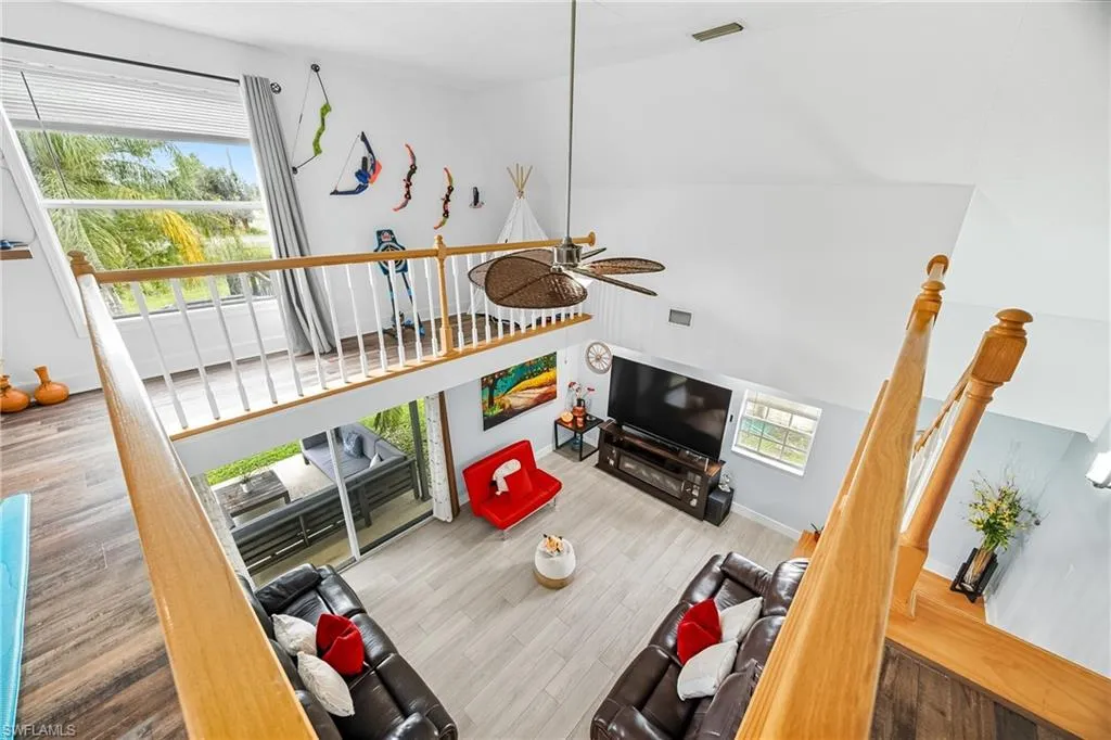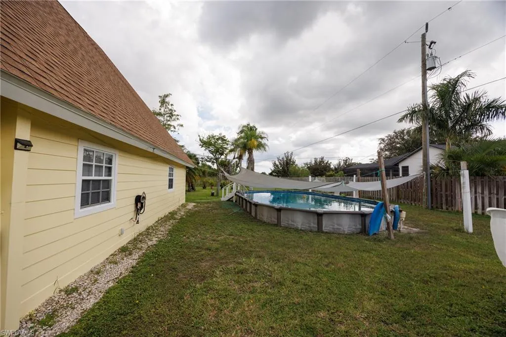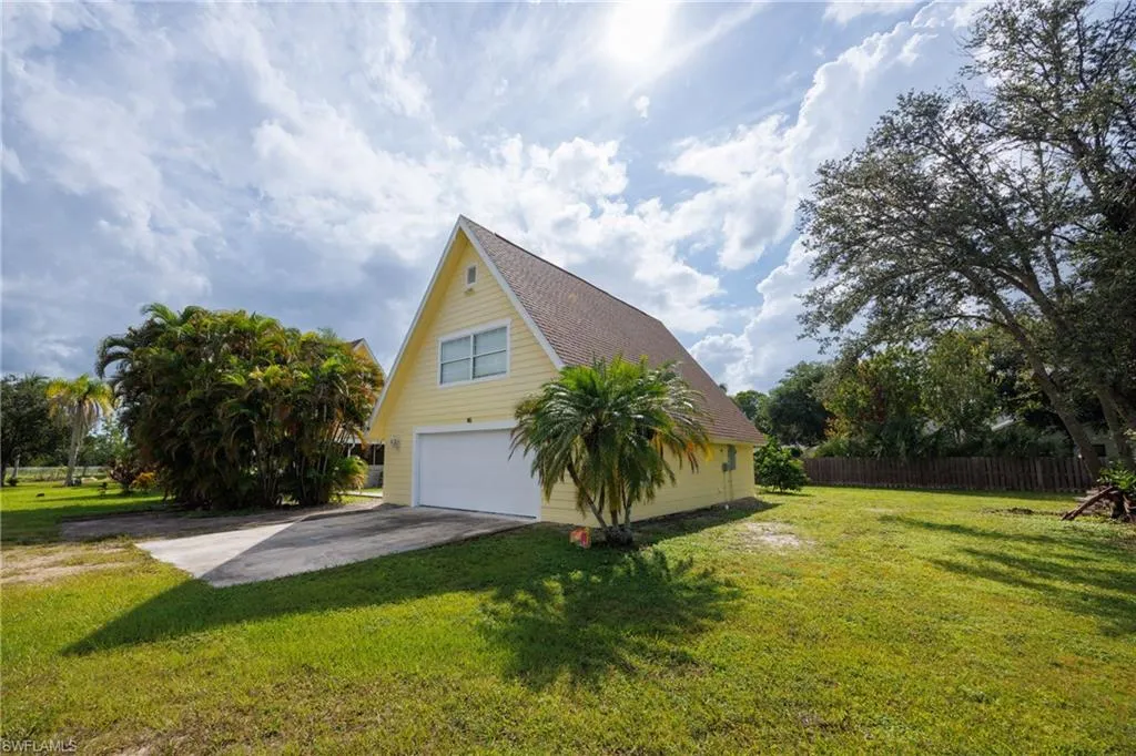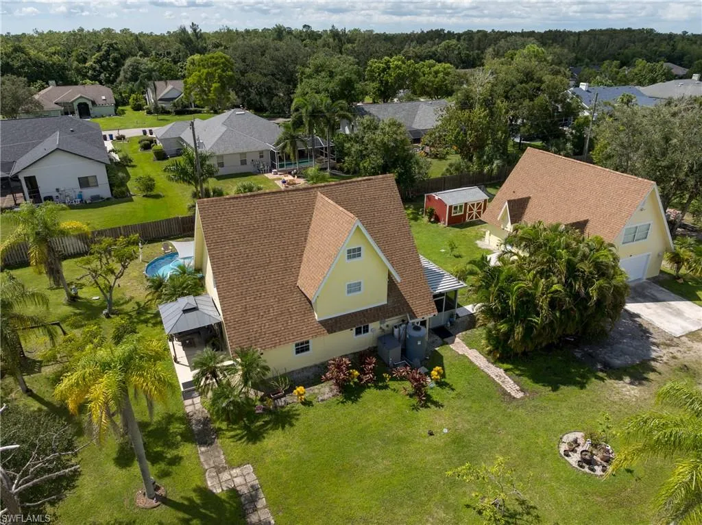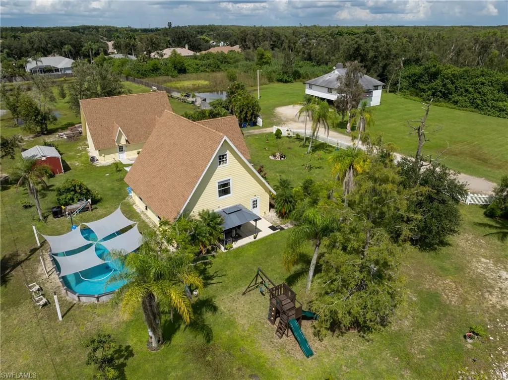 A one-of-a-kind country living experience awaits, perfectly situated just minutes from all the conveniences of town. This nearly 2-acre estate is an entertainer’s dream, featuring two separate homes on the front acre, each with its own address and electric meter, along with an additional undeveloped acre on a separate parcel. This unique setup offers incredible flexibility, whether you’re seeking rental income or building a family compound. Both homes received brand new roofs in 2024, along with hardy board siding in 2019, a heated above ground pool in 2022, new tankless water heaters in both houses in 2023, a new whole house R/O system for both houses and a new shed and fence in 2021. A new irrigation system was installed covering both acres. The primary residence is absolutely stunning with approximately 1790 sqft, boasting two primary bedrooms—one on each level—along with 2.5 baths and a versatile loft/den. The meticulously remodeled kitchen is a chef’s paradise, featuring white shaker cabinetry, quartz countertops, a sleek glass tile backsplash, and black stainless steel appliances which were replaced in 2022. Soaring ceilings in the living room create a dramatic and open feel, connecting to the loft area above. The first-floor ensuite and half bath showcase custom tile work, while wood plank tile flows throughout the main level and dark wood plank laminate graces the second. The upstairs bedroom is massive, with three closets and a luxurious bathroom featuring a huge walk-in shower. An upstairs loft offers the potential for a third bedroom. For outdoor enjoyment, a large screened lanai hosts a full outdoor kitchen, while an open patio with a pergola overlooks a fire pit area, playground, and picnic table. A nearby above-ground pool provides the perfect spot to cool off on sunny Florida days. The second home (7175 Penzance Blvd) with approximately 1247 sqft includes a living room, kitchen, half bath, and a first-level primary suite with tile flooring throughout. The second level features a large bedroom, a den with a closet, and a full bathroom. The AC was replaced in main house in 2021 and guest house AC was replaced in 2019. The rear undeveloped acre with address of 7161 Penzance Blvd is also zoned AG-2 and presents endless possibilities, from building a new home, pole barn, or barndominium to creating a private nursery, growing crops, or housing horses and other animals. County water is available if new owner wanted to hook up. With no HOA or CDD fees, and its location just off the Daniels corridor, this property offers unmatched convenience. It provides easy access to I-75, SWFL International Airport, spring training baseball, downtown Fort Myers, excellent schools, performing arts, hospitals, shopping, and the beautiful Sanibel, Captiva, and Fort Myers beaches.