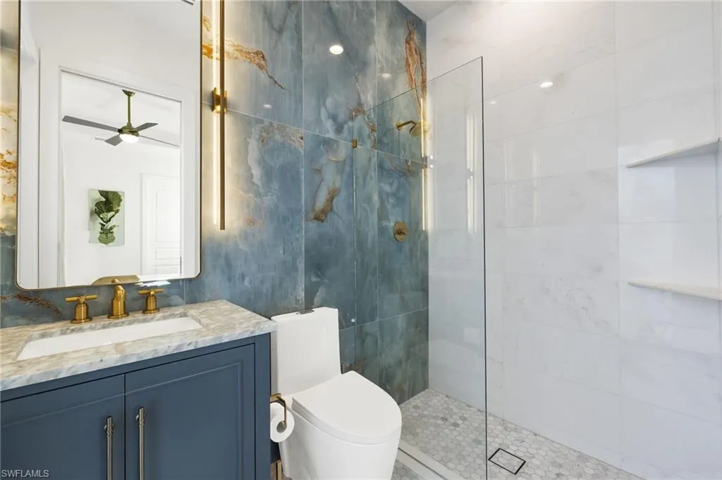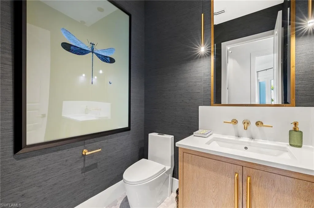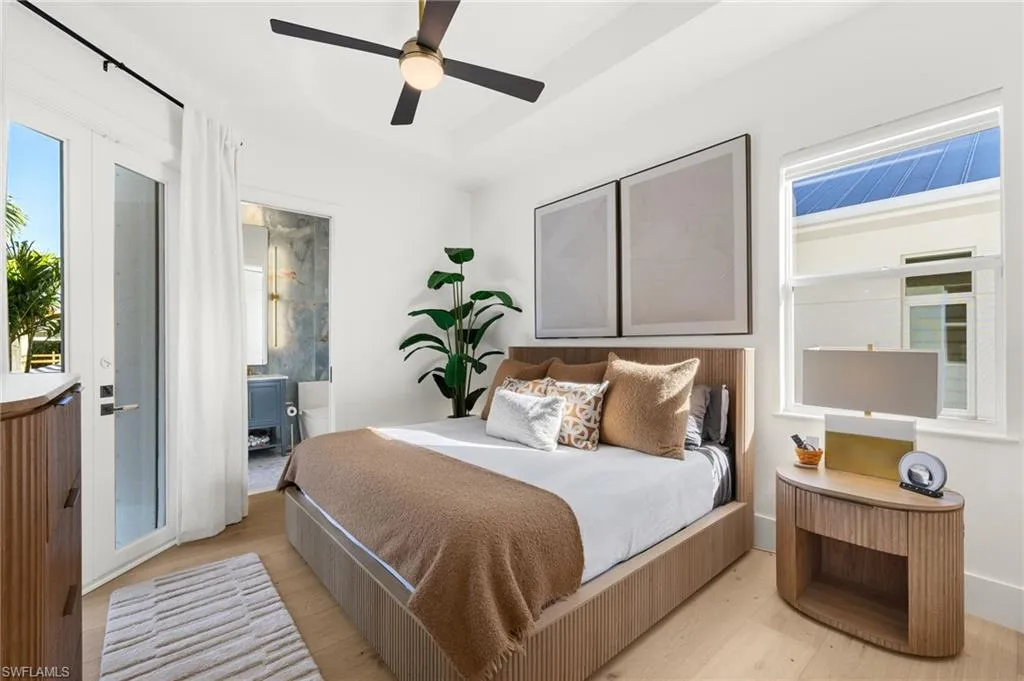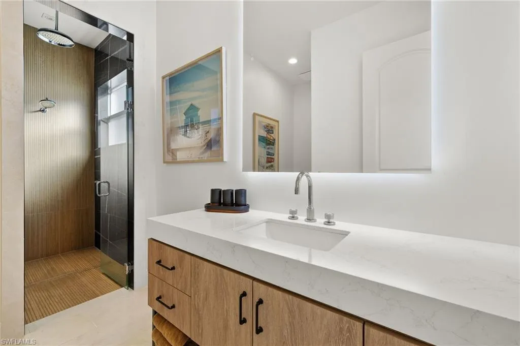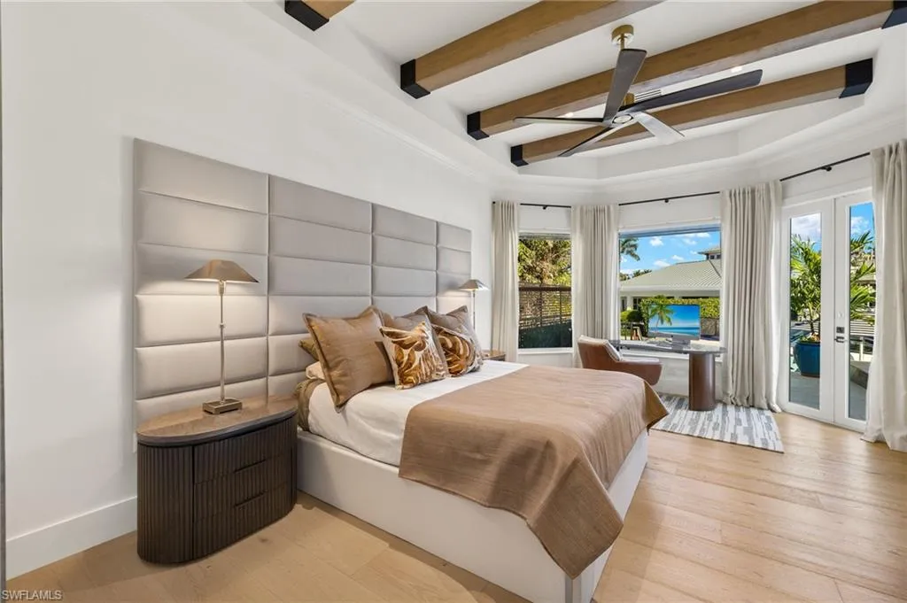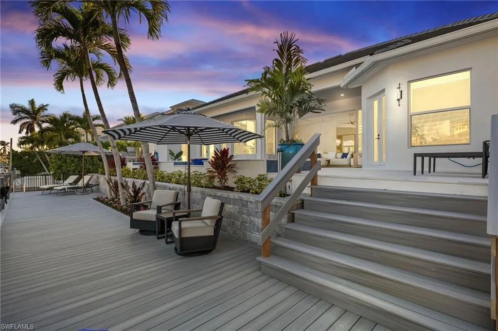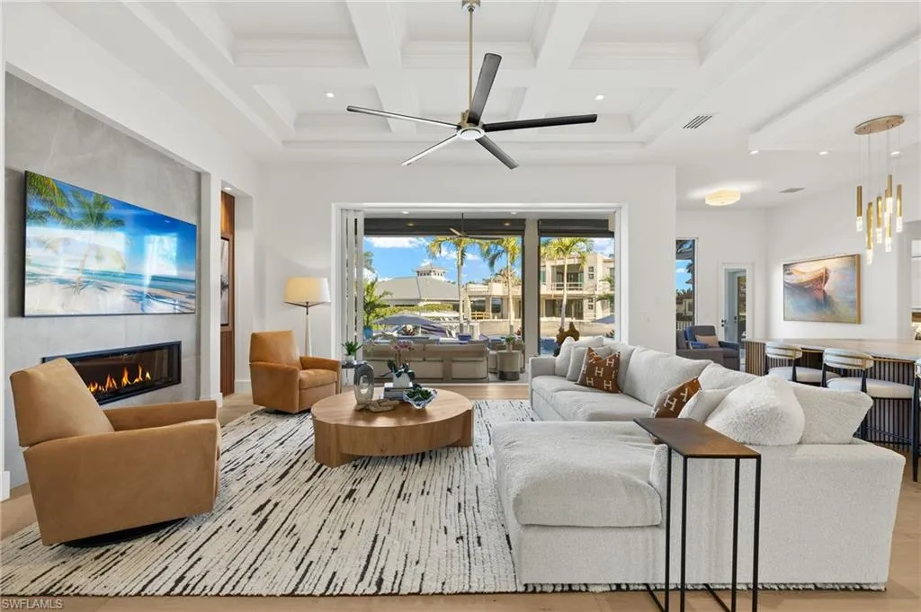 Enter into a welcoming foyer to a fabulous open-concept living space with soaring ceilings and heavenly expansive views of the outdoor living space. Gorgeous living room with 10″ light oak wide plank hardwood floors imported from France, coffered ceiling, linear fireplace and custom contemporary wood accents with wall of glass opening out to outdoor oasis with saltwater pool and spa, multiple lounging and entertaining areas, new seawall, new dock and new 16k pound boat lift. A true chef’s eat-in kitchen replete with oversized island perfect for daily dining and entertaining. Custom cabinetry, Thermador 6-burner range with hood and Gaggenau double refrigerator and freezers. Lovely sitting area overlooking the water plus dining room. Master suite oasis features a spacious bedroom with custom beamed ceiling overlooking the water, walk-in closet with custom built-ins, and a spa-like bath with oversized walk-in shower, freestanding soaking tub, double vanity and separate water closet. 2 additional guest suites plus a 4th bedroom with new leaded contemporary glass doors is perfect for den, home office or additional guest quarters plus a powder room and convenient laundry room. 2-car attached garage with epoxy floor plus gorgeous new landscaping and dramatic outdoor lighting. A boater’s dream with quick access to Naples Bay and the Gulf. Walk, bike or golf cart ride to downtown Naples renowned worldwide for its fine, dining, shopping and beaches. Easy access to Naples and Fort Myers airports. Truly exceptional Naples living at its finest.