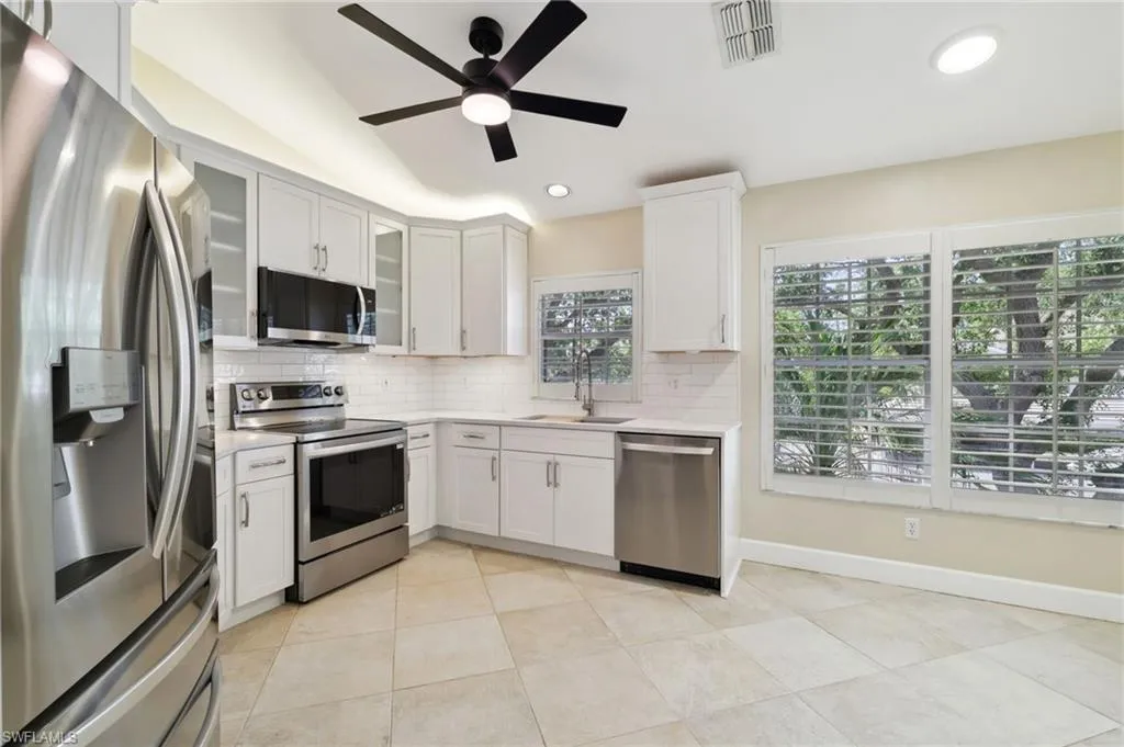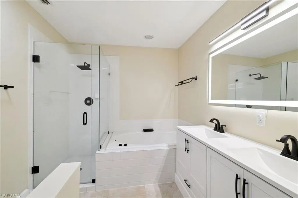 Welcome to 3770 Fieldstone Blvd, Unit 108 – a beautifully renovated end unit with no one above you, nestled in the highly desirable Wilshire Lakes community of Naples. This spacious 2-bedroom + den, 2-bath condo offers a perfect blend of elegance, comfort, and modern upgrades in a prime location just minutes from world-class beaches, shopping, and dining. Step inside to discover a light-filled, open floor plan with plantation shutters throughout, neutral tile flooring, and a versatile den that can easily function as a third bedroom. A built-in cutout allows space for a closet or custom built-ins, making it ideal for guests, a home office, or creative use. The kitchen is a showstopper, featuring all new stainless-steel appliances, sleek quartz countertops, upgraded cabinetry, and a deep farmhouse-style sink that adds a fresh, modern flair. The primary suite is its own private retreat, complete with his and her walk-in closets and a spa-inspired ensuite bathroom. Enjoy a luxurious soaking tub, a large frameless glass walk-in shower with a rain showerhead, and a double vanity with LED backlit mirror and matte black fixtures. The guest bathroom is equally impressive, offering a beautifully updated vanity, new sink and mirror, and a modern frameless sliding glass shower door over a full tub. Step outside to relax and unwind on the spacious screened-in lanai, now featuring new decorative tile flooring and fresh screening—perfect for morning coffee or an evening glass of wine in the Naples breeze. Wilshire Lakes is a gated community offering 24-hour security and resort-style amenities including two pools, a fitness center, tennis courts, and a beautiful clubhouse. This prime North Naples location is just minutes from Vanderbilt Beach, The Shoppes at Galleria & Mercato, where fine dining, shopping, and entertainment await. Whether you’re seeking a seasonal escape, investment property, or your forever home, this turnkey-ready condo delivers luxury and convenience in one of Naples’ most sought-after communities.