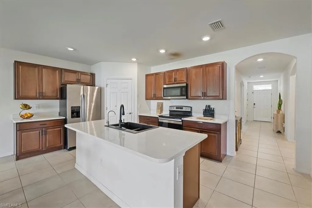 Welcome to your beautifully maintained SE Cape Coral home! This residence offers 1,828 sq. ft. of comfortable living space with thoughtful upgrades throughout. The home features a screened lanai and a fully fenced backyard, perfect for enjoying Florida living. Additional enhancements include a screened garage door, extended paver areas, and an upgraded bathroom. Inside, the kitchen is appointed with 36” Ashburn Sienna cabinets, quartz countertops, and stainless steel appliances. Blinds on all windows & slider, and ceramic wall shower tile in both bathrooms. Flooring is 18” tile in main areas and carpet in the bedrooms. Practical features include an electric garage door opener, dimensional shingle roof, full irrigation system, and a Home-Is-Connected convenience package. Assessments are paid, and the property is located near Del Prado Blvd. and Veterans Pkwy, offering easy access to shopping, dining, and more.