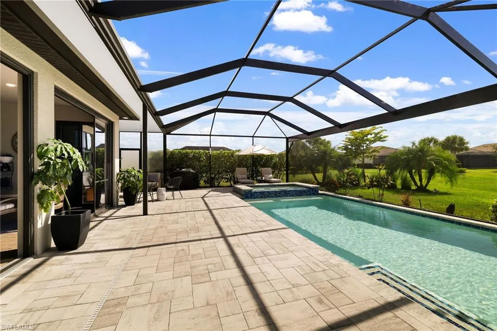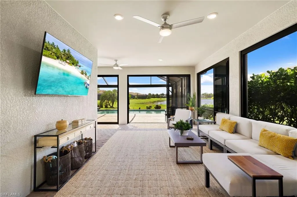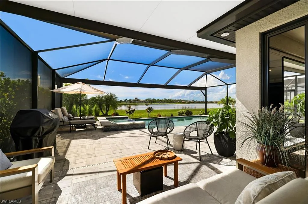 Designed for seamless indoor-outdoor living, the POCKETING SLIDING GLASS DOORS open to an enclosed, extended covered lanai with sliders that create an additional 378 square feet of temperature-controlled space—perfect for year-round enjoyment. The lanai transitions effortlessly to a CUSTOM DESIGNED SALTWATER POOL AND SPA. With WEST REAR EXPOSURE and sweeping LAKE VIEW through the extended PANORAMIC SCREEN, this outdoor retreat offers an impressive backdrop for relaxation and entertainment, highlighted by stunning sunsets. Positioned on a generous 0.23-acre lot, this residence blends modern design with a serene waterfront setting, creating a lifestyle defined by comfort, elegance, and ease.