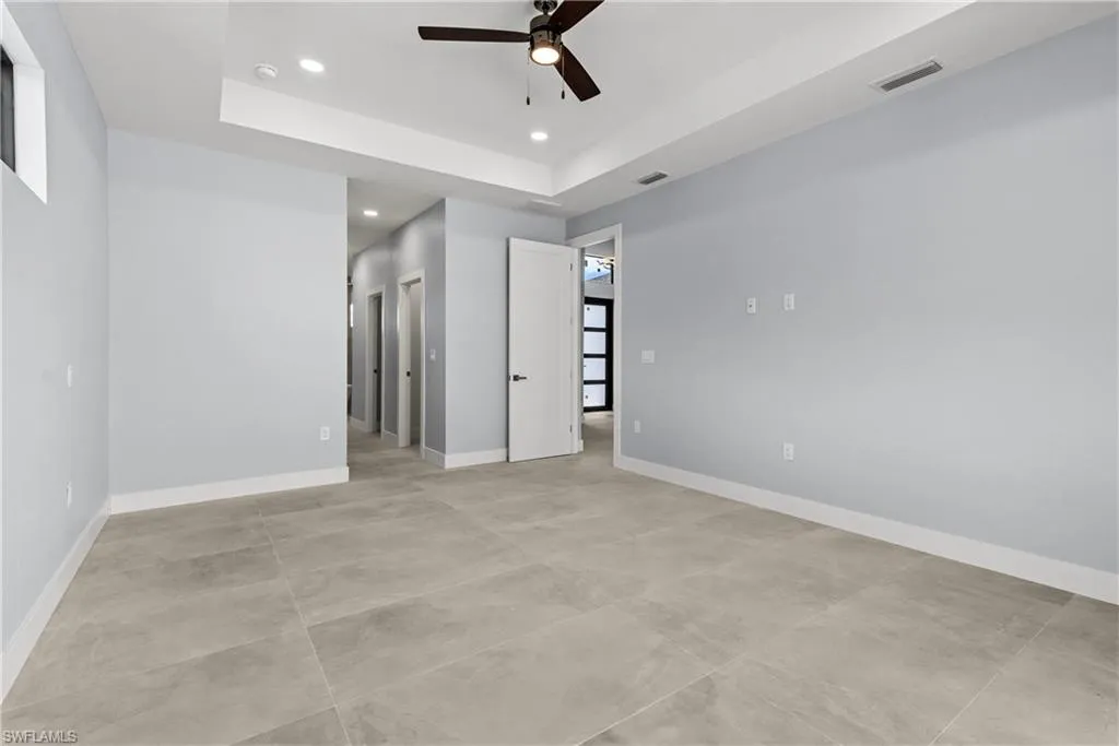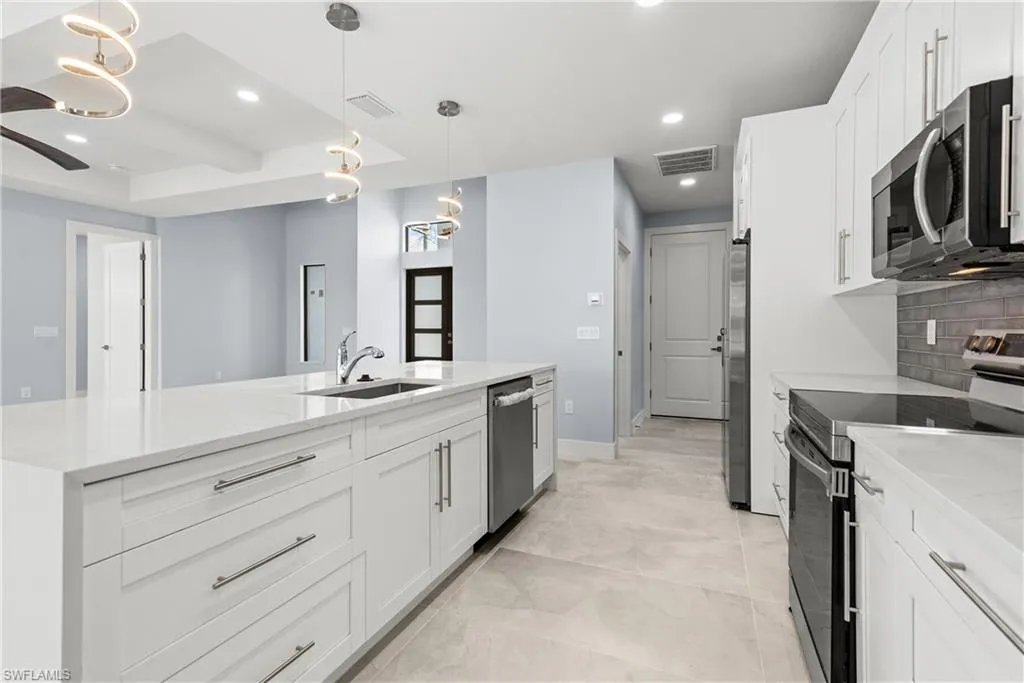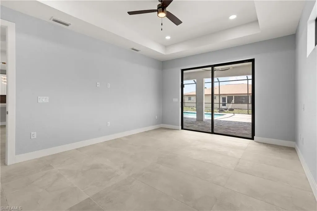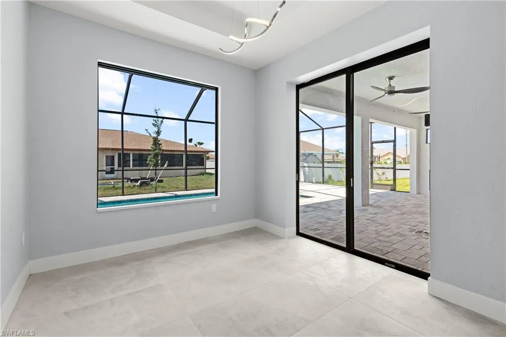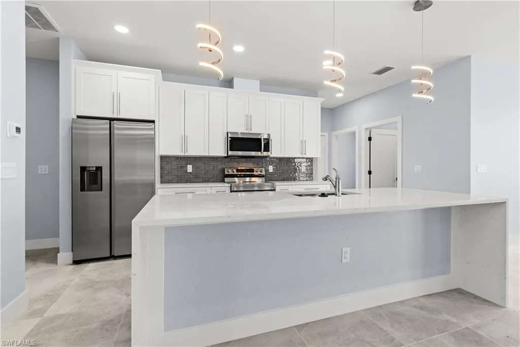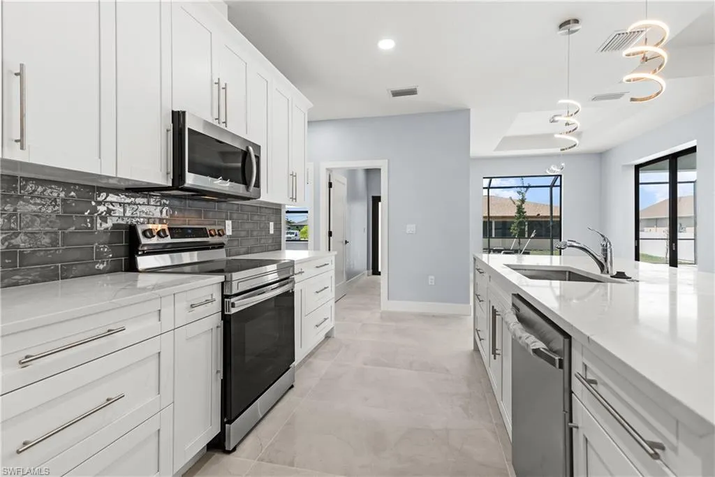 Under Construction-Waterfornt Single Family Residence located in NW Cape Coral. Spaciously designed 3/3/3 with den/office will feature a 14’4 impact double door entry, open floor plan, 9’4 coffered ceilings and imported 24×48 tile flooring throughout. The kitchen’s oversized quartz waterfall island will feature an under-mount single bowl stainless steel sink, room for meals around the island, and stainless steel appliances completing the versatility of this spacious kitchen. All baths and kitchen will include quartz countertops, fit & finished with soft close drawers and cabinets, shower only and accented with pendant and wall lighting. The guest bath designed to enter onto the paved pool deck and screened lanai will conveniently serve as pool bath.