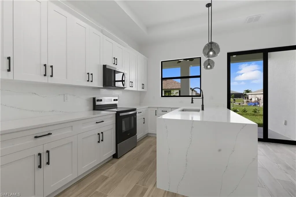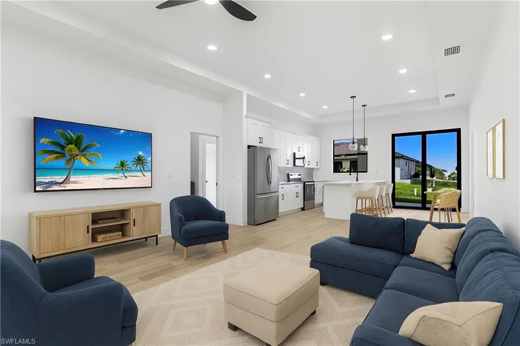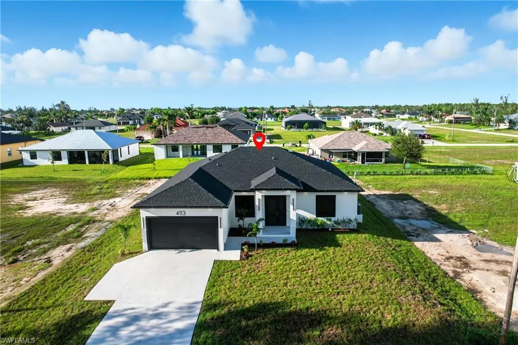 Brand-new 4 BR + den, 3 BA ranch-style home in one of Cape Coral’s most desirable neighborhoods! Featuring an open floor plan with high ceilings, abundant natural light, and a gourmet kitchen with custom cabinetry, stainless appliances, and elegant countertops. The primary suite offers a walk-in closet and spa-inspired bath with dual vanities and a walk-in shower. A versatile guest/in-law suite with private bedroom, bath, and den provides the ideal space for extended family, visitors, or a home office. Enjoy Florida living on the covered lanai, complete with a rough-in for a future outdoor kitchen. Close to shopping, dining, schools, and Gulf beaches!