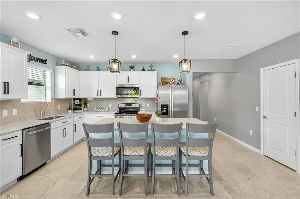 Step inside to a bright living area and modern finishes throughout. The kitchen is highlighted by sleek quartz countertops, stainless steel appliances, and a spacious island perfect for gathering. The primary suite features a walk-in closet and private bath, while three additional bedrooms provide plenty of space for family, guests, or a home office.