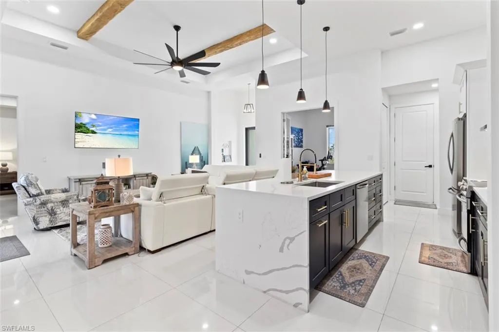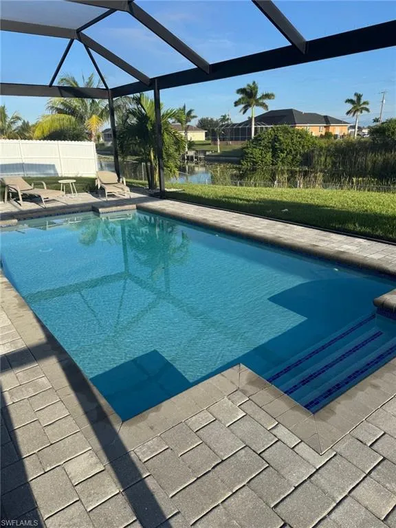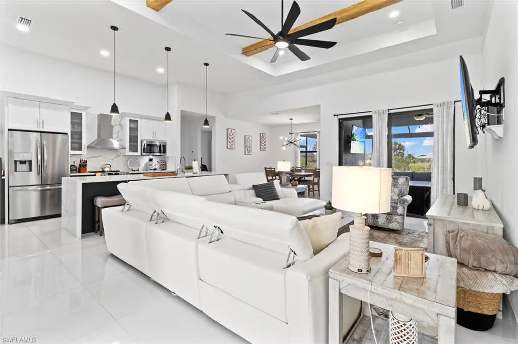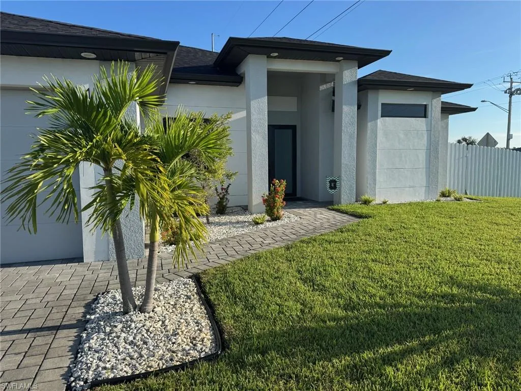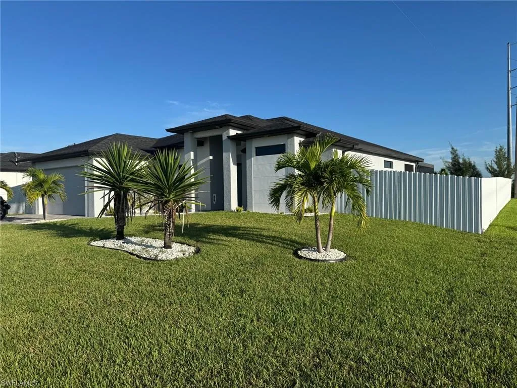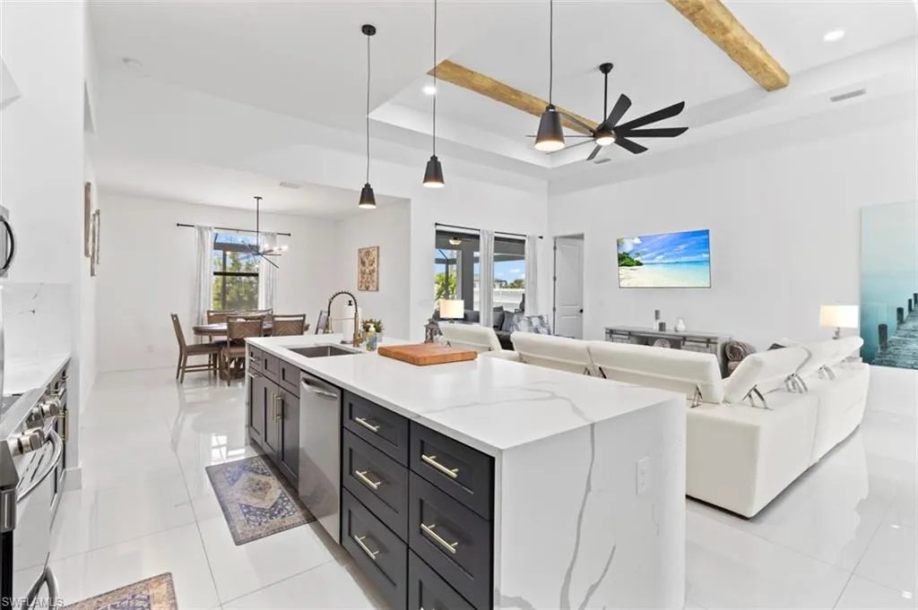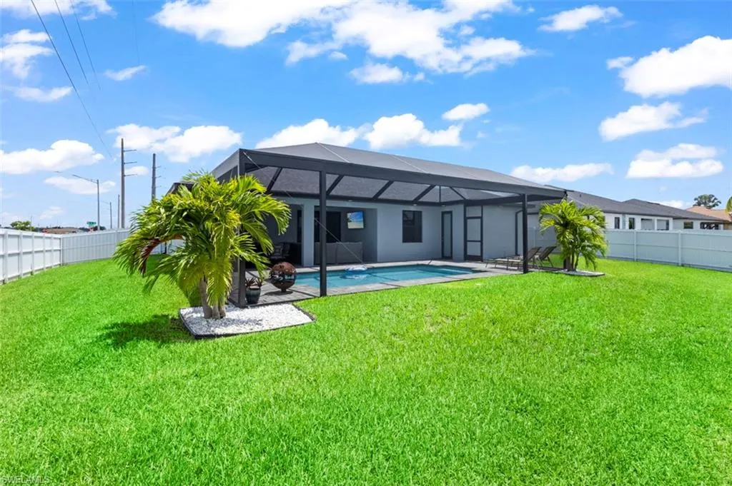 You’ve got to see this one before it’s too late. Stunning and Contemporary canal front home in great location. The salt water pool is heated with pool cage and picture frame screens to enhance the views of the Hermosa canal. There is so much to love about this home. The huge covered lanai, outdoor kitchen, fully fenced yard and totally upgraded interior is just the beginning. The great room is a totally open plan with recessed ceilings, wood beams and great views. It’s on city water and sewer with all assessments paid at closing. It’s not in a flood zone, so no Flood Insurance required here. The seller is offering $2,500 towards the buyers closing costs. There are three large bedrooms plus a great den/office, 3 full baths including a direct access pool bath. There is an amazing primary suite with recessed ceilings, two walk-in closets, a luxurious bath with soaking tub and separate shower, plus a second guest suite with direct access bath. The kitchen is a chef’s dream with two tone custom cabinets, quartz counters with oversized waterfall island, upgraded Frigidaire Stainless Steel Gallery appliance package, built-in microwave and separate vent hood, a wonderful pantry and frosted glass accent cabinet doors. The laundry is large with cabinets above the laundry area, a laundry sink and built-in storage area with shelves. The home also has hurricane impact windows/doors, 8ft. interior doors and sliders, and an Impressive 8 ft frosted glass double door entry. One of the best things about this home is the central location, just minutes from the Pine Island shopping corridor. It’s back yard and covered lanai face north which is a great to enjoy the wonderful sunrises and sunsets over the Hermosa Canal. This home checks all the boxes, it’s a must see.