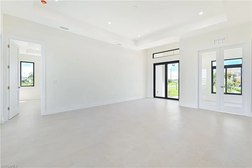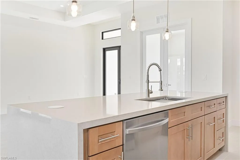 Inside, enjoy 8-foot tall doors, an open great room layout, and impact-resistant 7/16 windows and doors. The kitchen features double-stacked shaker-style cabinets, sleek countertops, and high-end appliances—perfect for entertaining or everyday living. The den and laundry room add versatility for work-from-home needs or extra storage, while the open patio/lanai to savor the water views.