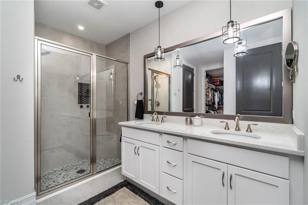 The primary suite is thoughtfully tucked away for privacy and comfortably accommodates a king-size bed. It features a spa-like ensuite with double vanities, an upgraded walk-in shower with designer tile and niche accents, a linen closet, and a custom walk-in closet.