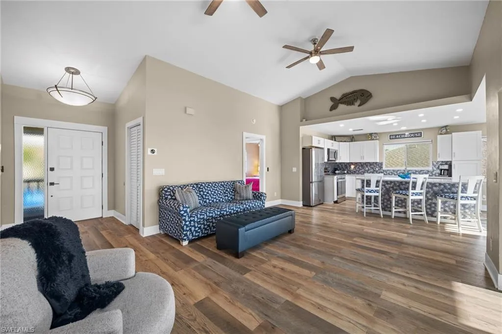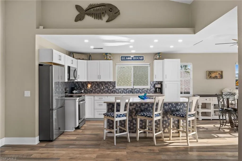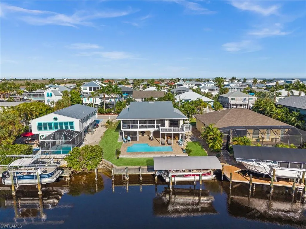 Whimsical Island Living in St. James City! Dive into your own paradise with a brand-new custom pool just completed —complete with sun shelf, LED bubblers, glow lighting, and a saltwater system. Add direct Gulf access and a 8K boat lift with canopy and composite captains walk dock – adventure by water minutes away. From your dock it’s a quick ride to the open bayfront, where the sandy beaches of Sanibel, Captiva, Cayo Costa, and Boca Grande await, along with the world-famous fishing grounds of Pine Island Sound. Fresh landscaping throughout and maintenance as well. Inside, vaulted ceilings and sunlit spaces create a breezy, open feel. The remodeled kitchen in 2024 sparkles with quartz countertops, white raised-panel cabinets, center island and stainless appliances. Sliders from the great room open to a spacious screened lanai, while an open-air balcony off the kitchen is perfect for morning coffee or sunset cocktails. The primary suite is a private retreat with lanai access, two closets, including a walk-in, and a spa-like bath. Guests can enjoy their own wing with a pocket slider for added privacy. Nearly every room whispers water views, reminding you that the Gulf is never far. On the lower level, a second screened lanai, shaded gathering space, and two flexible storage rooms offer endless options—outdoor kitchen, game area, workshop, or guest hideaway. There’s also covered parking below the home with plenty of space for your golf cart—an essential for enjoying the golf cart–friendly streets of St. James City. Recent updates including a new roof (2023), Pergo flooring, and seawall reinforcement mean peace of mind while you simply enjoy island life. From sun-up to sun-down, this home blends updates, whimsy, and waterfront fun—an island escape made for living.