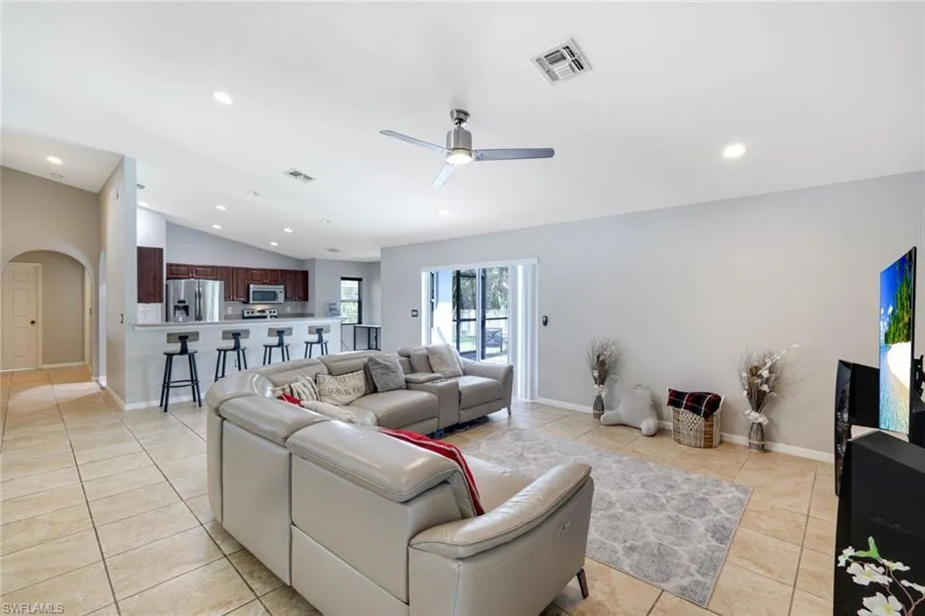 Welcome to your new home in highly desirable Northeast Cape Coral! This spacious 3-bedroom + den, 2-bathroom pool home offers the perfect blend of comfort and Florida lifestyle living. With over 2,000 sq ft., this open floor plan is ideal for entertaining, while the private screened-in pool area provides a relaxing retreat for family and friends. Enter the house through elegant double entrance doors, into the large and appealing living area with sliding doors to the lanai and pool area. With a versatile den that can serve as a home office, guest space, or playroom, this property adapts to your needs. The kitchen features large countertops for durability, pantry, stainless steel appliances and large breakfast nook as well as a family size dining room. The primary suite has two walk-in closets, in master bathroom the focal point is a gorgeous and large tub, with a large walk around shower behind it. It also has 2 separate vanities/sinks and a private toilet closet. Outside you will find your own tropical oasis and will enjoy the best sunrises that Florida has to offer. This incredible home also offers a brand-new roof, solar panels that greatly reduce your monthly expenses, new well pump, new pool pump and new cartridge for filter and an UV filter for the AC. The house has a security ADT alarm system and the front door with a code panel and hurricane shutters for safety. No Flood Insurance Required!!!! Do not miss this opportunity on this amazing home, starting the next chapter in your life.