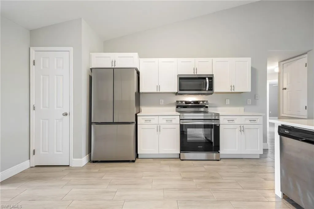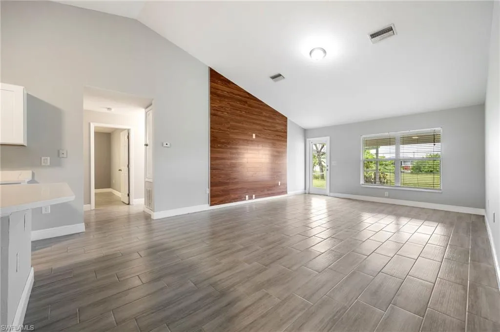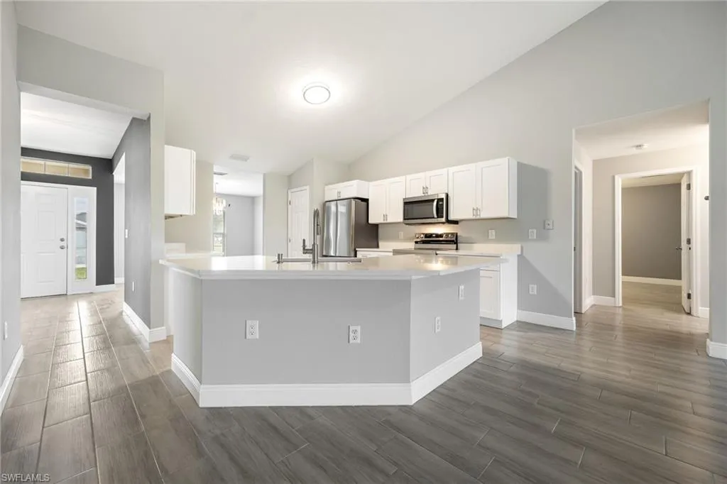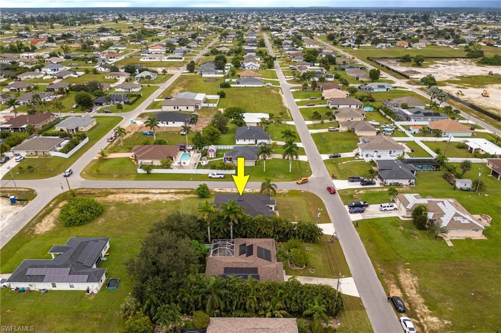 Spacious & Stylish Living on a Sweeping Corner Lot – No Flood Zone! Fall in love with this expansive 4 bedroom, 3 bathroom home offering over 2,400 square feet of living space. The heart of the home is the updated kitchen, complete with quartz counters, new sink, shaker style soft close cabinets and drawers, buffet style counter with extra storage, pantry, stainless steel appliances including a new fridge, stove, and microwave. A dream for both everyday living and entertaining, the layout features a formal dining room for gatherings, and a spacious family room with vaulted ceiling and an eye catching accent wall. Beautiful tile floors flow seamlessly throughout, paired with blinds on every window for move-in-ready comfort. A flex space that is perfect for additional living, playroom, or home office. The primary suite is like no other, with two walk-in closets and TWO full bathrooms! Three additional large bedrooms offer ample space for family and guests. Outside you will enjoy the screened, under-truss lanai, perfect for morning coffee or evening relaxation. The sweeping corner lot provides curb appeal and extra room to spread out, while a 2023 roof adds peace of mind and hurricane shutters for the windows too. Best of all, this home sits in a no flood zone. Move in Ready and waiting for you, so come visit today and make Cape Coral your new home.