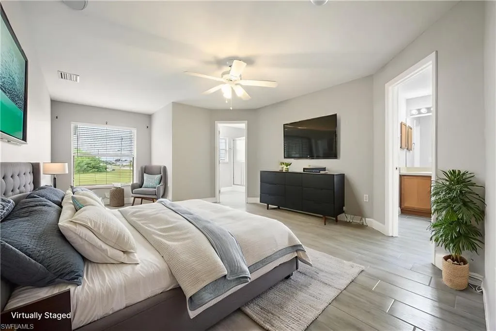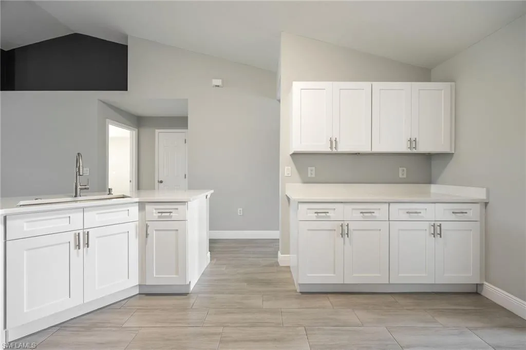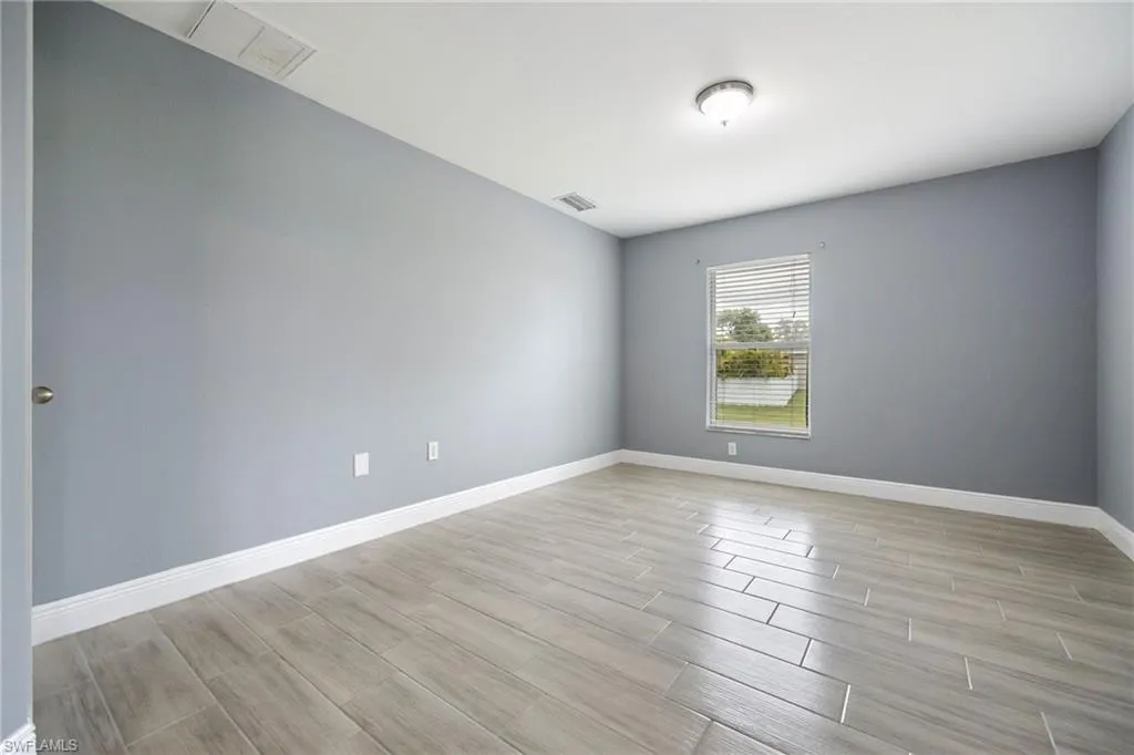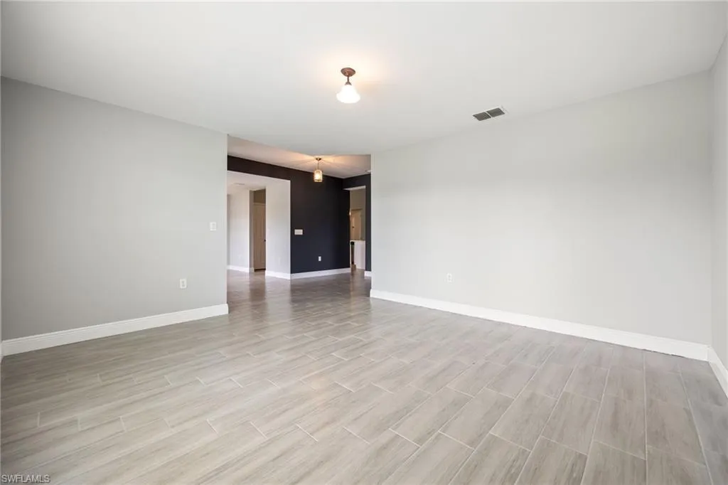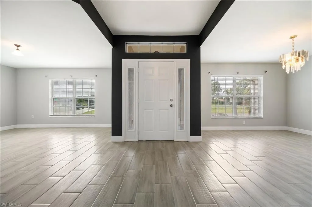 Spacious & Stylish Living on a Sweeping Corner Lot – No Flood Zone! Fall in love with this expansive 4 bedroom, 3 bathroom home offering over 2,400 square feet of living space. The heart of the home is the updated kitchen, complete with quartz counters, new sink, shaker style soft close cabinets and drawers, buffet style counter with extra storage, pantry, stainless steel appliances including a new fridge, stove, and microwave. A dream for both everyday living and entertaining, the layout features a formal dining room for gatherings, and a spacious family room with vaulted ceiling and an eye catching accent wall. Beautiful tile floors flow seamlessly throughout, paired with blinds on every window for move-in-ready comfort. A flex space that is perfect for additional living, playroom, or home office. The primary suite is like no other, with two walk-in closets and TWO full bathrooms! Three additional large bedrooms offer ample space for family and guests. Outside you will enjoy the screened, under-truss lanai, perfect for morning coffee or evening relaxation. The sweeping corner lot provides curb appeal and extra room to spread out, while a 2023 roof adds peace of mind and hurricane shutters for the windows too. Best of all, this home sits in a no flood zone. Move in Ready and waiting for you, so come visit today and make Cape Coral your new home.
