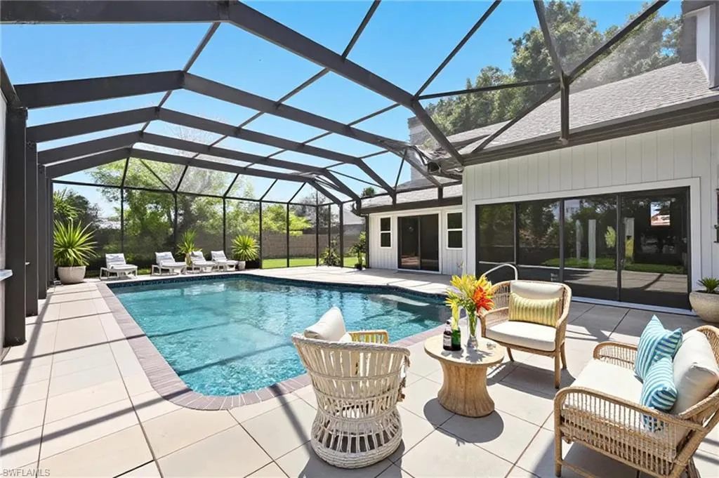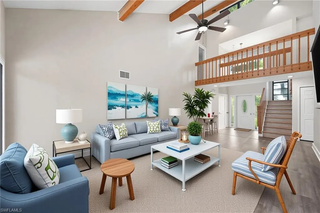 Welcome to 1576 Beechwood Trail. If you are looking for a home with a little personality, this is the one! This inviting 4-bedroom, 3-bath home in the Whiskey Creek neighborhood of Fort Myers offers plenty of space with over 2,400 sq. ft. of comfortable living. You’ll love the bright and open floor plan, featuring vaulted ceilings with charming exposed beams, 2nd story walk-way overlooking the main level and an updated kitchen that’s perfect for family meals or hosting friends. You’ll appreciate the coffee bar area with wine rack, ample counter space and extra cabinetry. A sprawling main level filled with windows and patio doors makes every day sunny and energizing. You’ll also find two main level bedrooms, including one with private access to the pool area and an updated 3/4 bath. The upper level has 2 primary suites both with ensuite bathrooms. You can access your exceptional back yard from a spiral staircase on the 2nd level, or the patio doors on the main floor. Enjoy the best of Florida living with a screened lanai and sparkling swimming pool—a great spot for barbecues, pool parties, or simply relaxing after a long day. Enjoy the shade from the mature trees in your yard while the birds sing to you. An oversized 2 stall garage adds additional storage space for tools, toys or sports equipment. In an area that offers the ideal mix of peace and convenience, you’ll find shopping, dining, and schools just a short drive away.