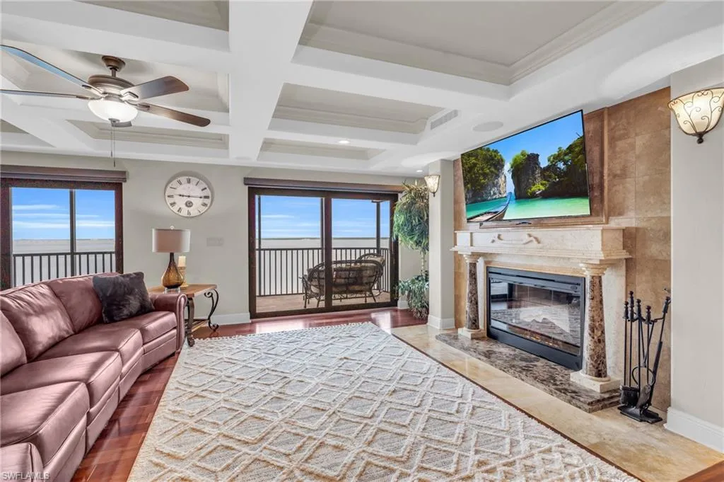 Perched on the 9th floor of one of Fort Myers’ most sought-after riverfront communities, this exceptional 4-bedroom, 3.5-bath residence offers nearly 4,000 square feet of refined living space with sweeping, unobstructed views of the Caloosahatchee River. Designed for those who appreciate both comfort and sophistication, the home has been fully reimagined with high-quality finishes, hurricane-rated windows and doors, and smart technology enhancements throughout. The condo complex is structurally sound based on new condo guidelines and no current assessments are due. The gourmet kitchen serves as the heart of the home, boasting premium appliances, custom cabinetry, and a full-service bar ideal for entertaining. Expansive living and dining areas flow seamlessly, accentuated by warm wood details and elegant flooring, creating a setting that balances openness with intimacy. The primary suite is a luxurious retreat, featuring a spa-inspired bath with a glass-enclosed shower equipped with dual shower heads and multiple jets, along with a custom-designed walk-in closet that offers extraordinary storage and style. Private balconies invite you to savor vibrant sunsets and the calming waterfront vistas, while abundant storage and thoughtful details ensure both beauty and practicality. For convenience, the property includes two first floor coveted garage parking spaces located just steps from the building entrance, as well as two private storage units. Residents enjoy peace of mind with 24-hour guarded security and an array of resort-style amenities such as a riverfront pool, fitness center, and direct access to the vibrant dining, shopping, and cultural experiences of downtown Fort Myers. Combining unmatched square footage, timeless elegance, and panoramic views, this residence presents a rare opportunity to own one of the finest homes along the riverfront.