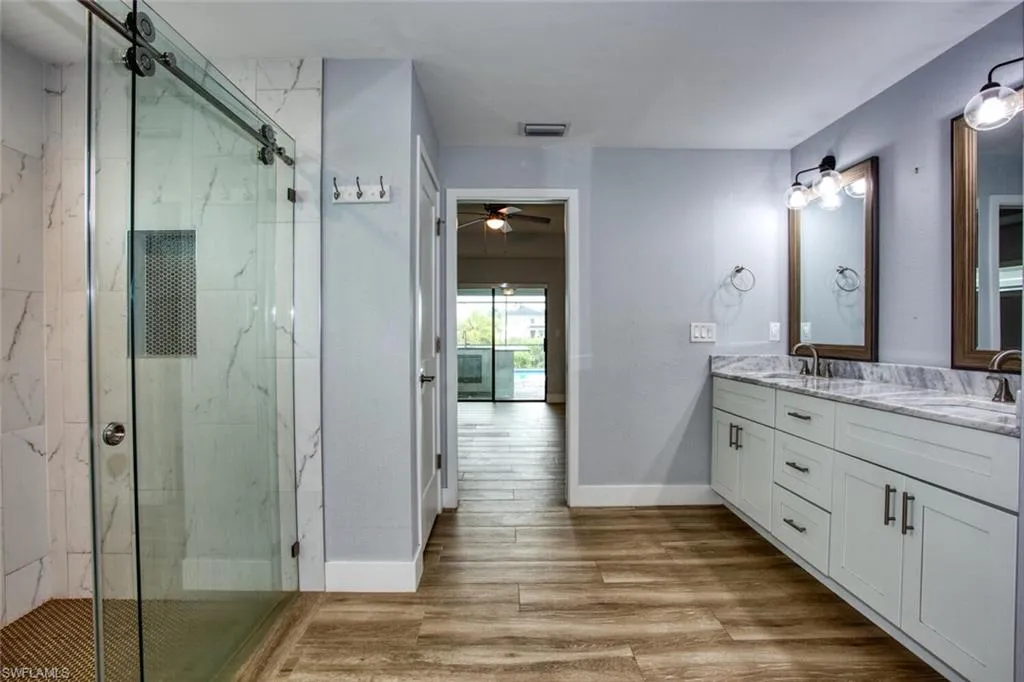 Step inside to an open concept layout featuring soaring 11-foot ceilings and seamless flow from the living area to the outdoors. The spacious master suite boasts a luxurious bathroom, oversized walk-in closet with custom built-in cabinetry, and private access to the pool area.