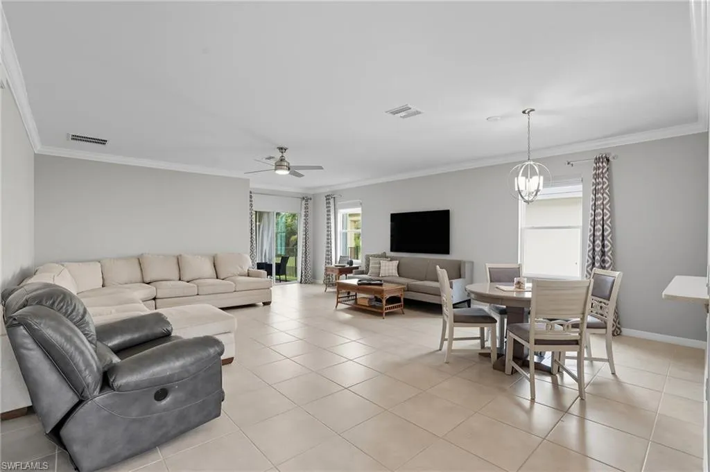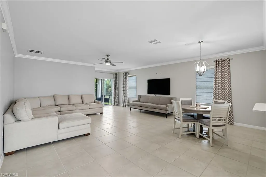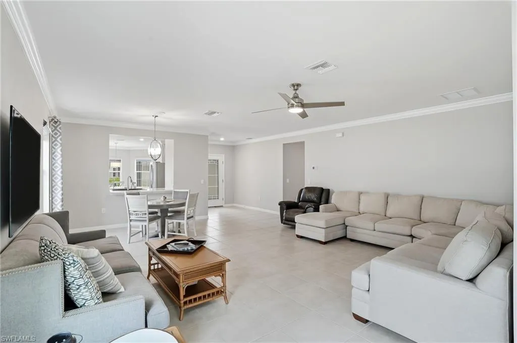 Inside, the open-concept floor plan is designed with both comfort and functionality in mind. The spacious living room flows seamlessly into the dining area and kitchen, creating the perfect setting for entertaining guests or enjoying family time. Large windows and sliding glass doors allow abundant natural light to fill the home while providing easy access to the screened lanai. The kitchen is equipped with modern cabinetry, ample counter space, and a convenient breakfast bar for casual dining.