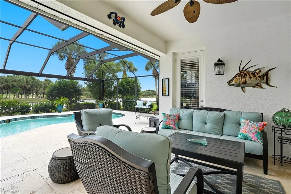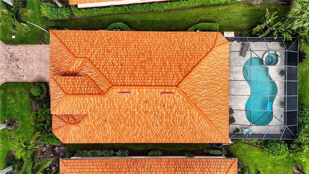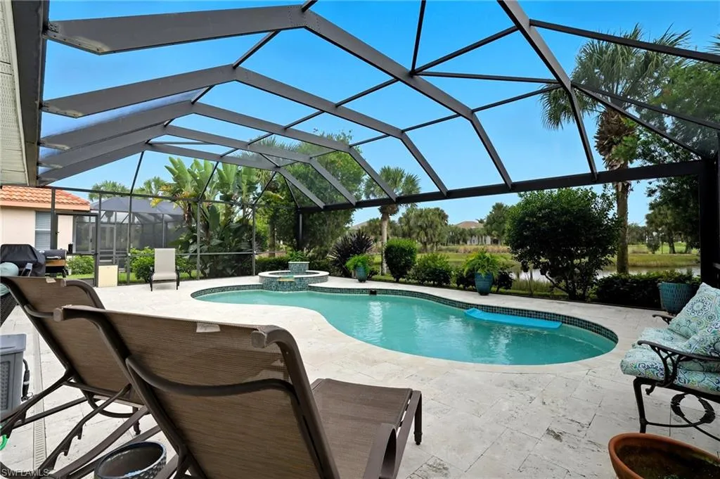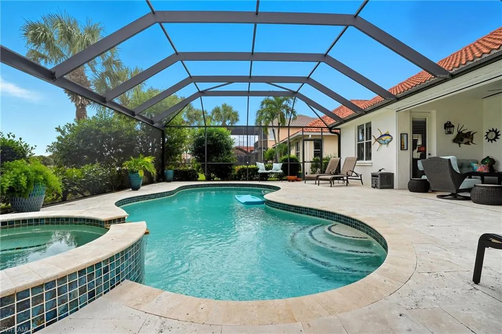 Outdoor living shines with a redesigned pool, hot tub, and travertine pool deck. Recent enhancements include Storm Smart retractable hurricane shutters (2018), low-voltage outdoor lighting (2019), new lanai screens with a picture-frame full-view enclosure (2024), new pool heater and pump (2023), and fresh exterior paint (2022).