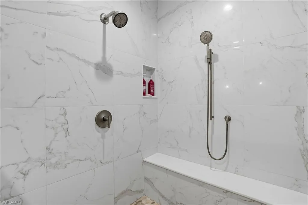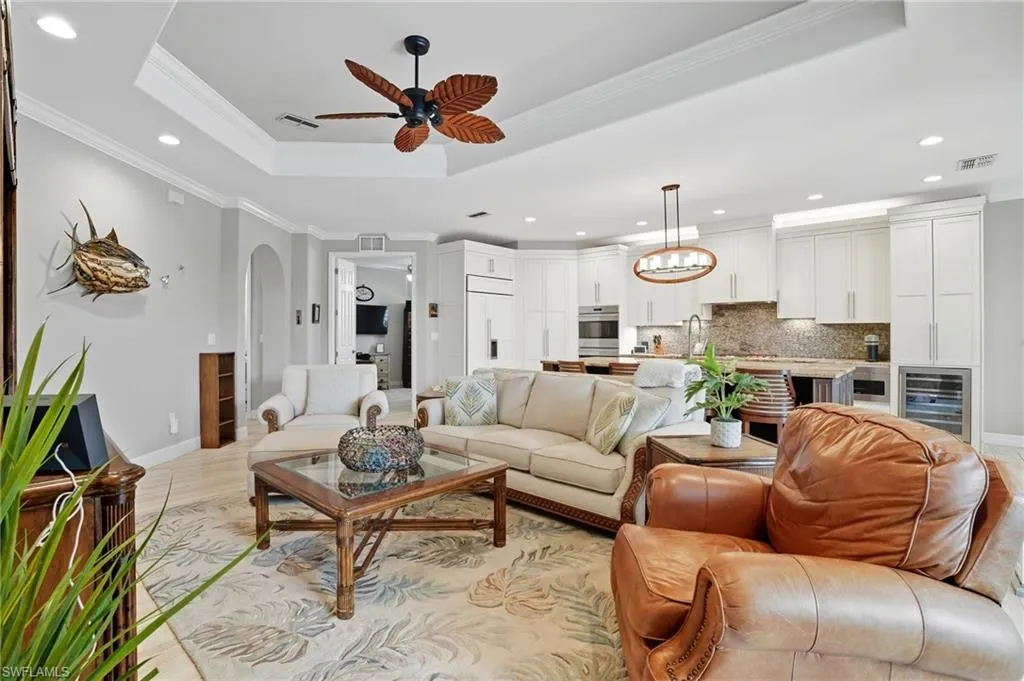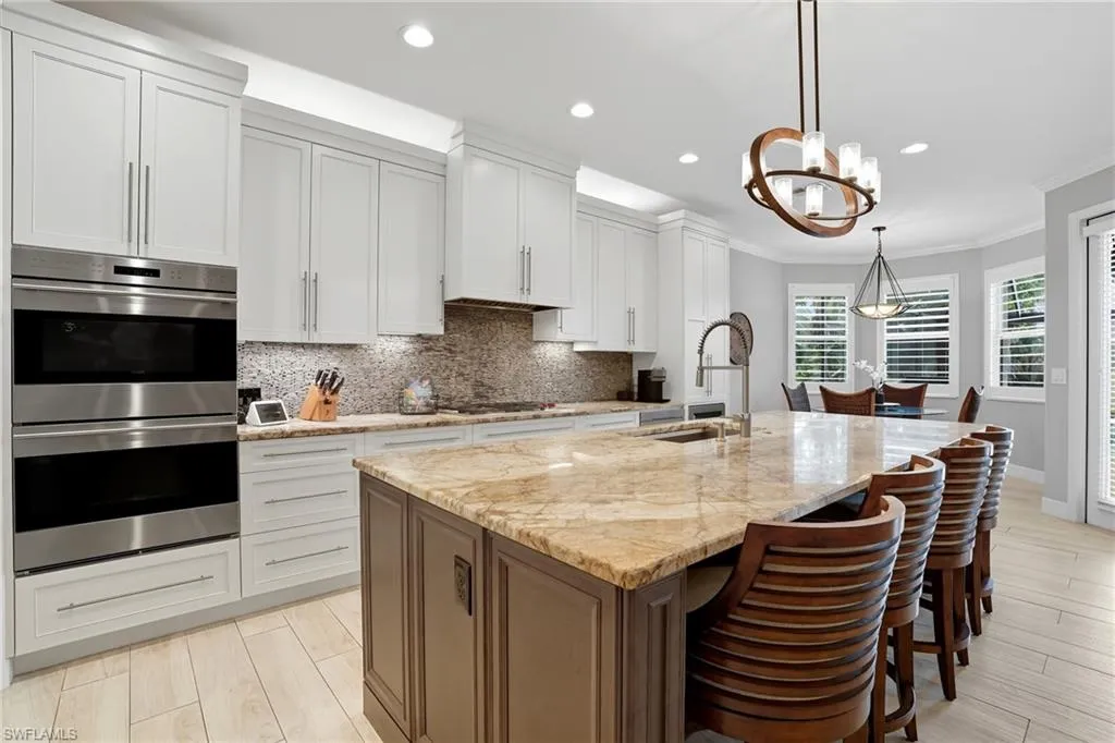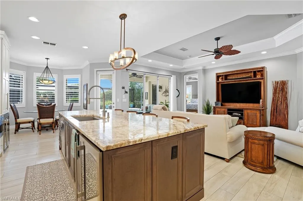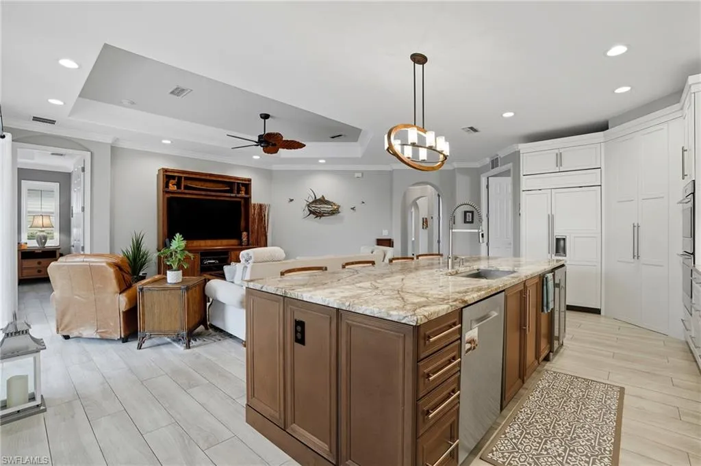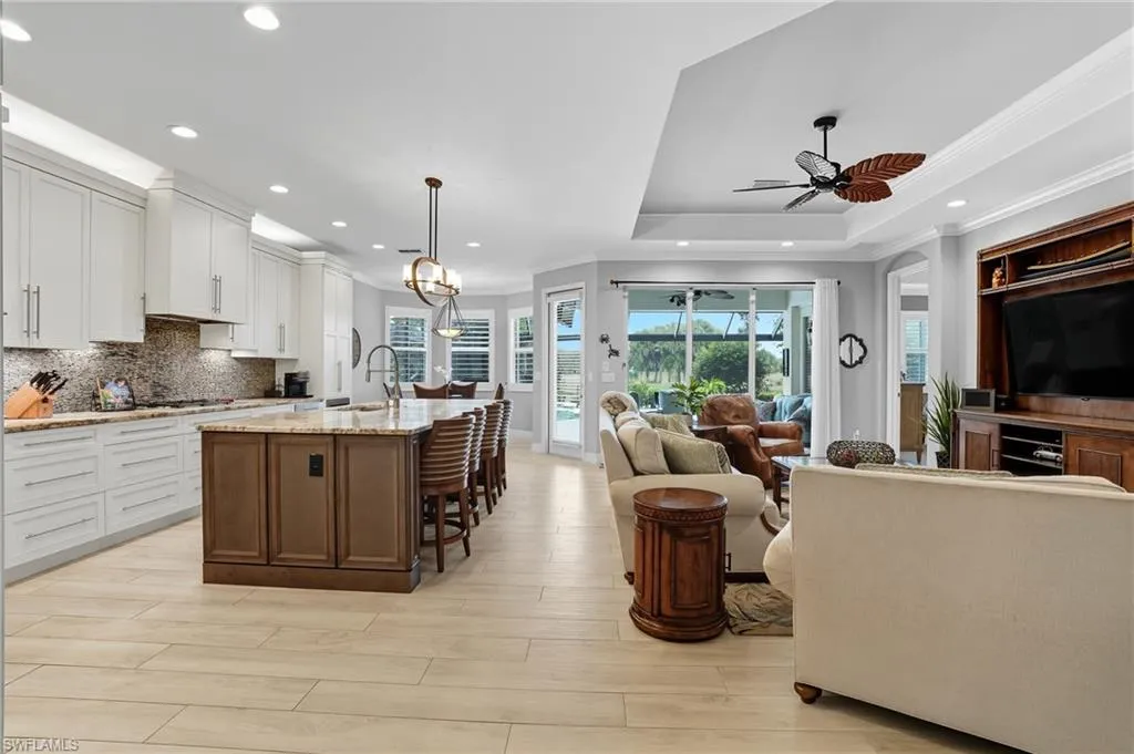 A truly beautifully reimagined 3-bedroom + den, 2.5-bath residence that blends timeless design with modern luxury. In 2018, the owners partnered with Randall Mitchell Builder for a complete renovation, featuring a redesigned kitchen, updated bathrooms, and a refreshed pool and outdoor living area.” full interior renovation, thoughtfully redesigning the entire living space for open flow and refined living. The kitchen and main living areas were reconfigured by removing walls for a open floor plan, complemented with elegant trim work. The chef’s kitchen boasts custom cabinetry, a walk-in pantry with electrical outlets, Wolf and Sub-Zero appliances, beverage and wine refrigerators, and a custom bar with beverage cabinet—perfect for entertaining.