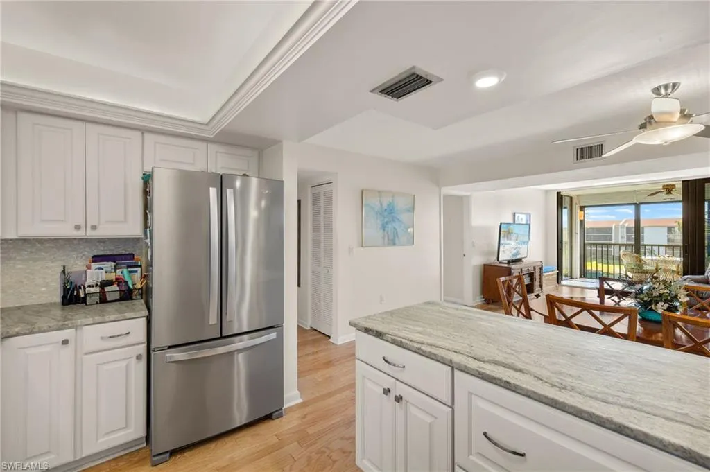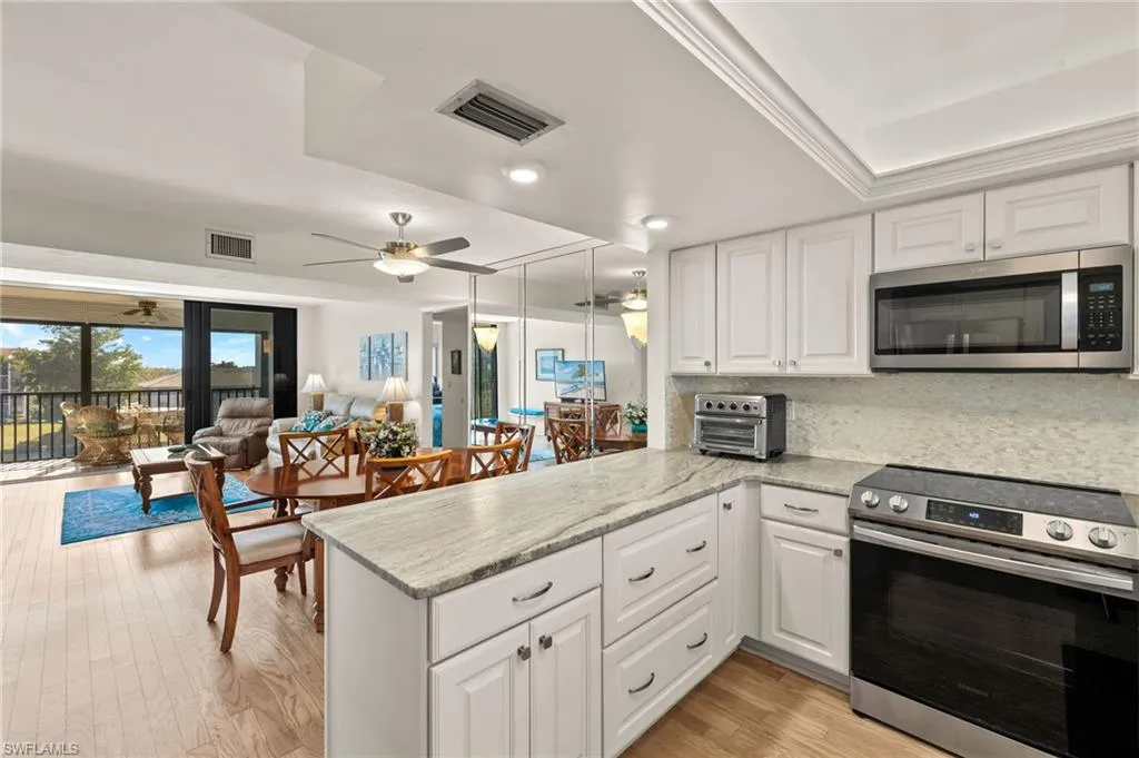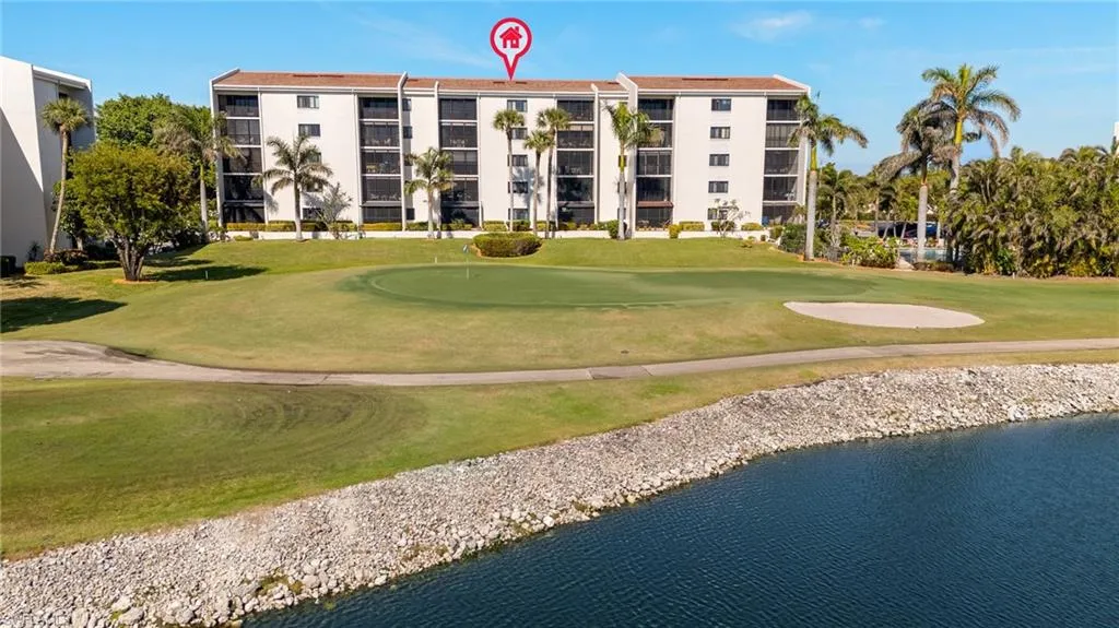 Stunning view of Golf Course, Lake, and Fountains from this 4th floor, THREE Bedroom, TWO Bath UPDATED condo. Updates include: Newly remodeled kitchen with Upscale “LEATHERIZED” GRANITE, designer backsplash, and NEW Stainless-Steel appliances. Hardwood Floors throughout living area. NEW Carpet recently installed in all three bedrooms. Primary and Guest Baths have lovely updates. HURRICANE sliders and windows! New air conditioning unit and hot water heater. MOVE-IN… TURN-KEY! Underground parking. The Landings Yacht Golf and Tennis Clubs is one of the most prestigious communities off McGregor. Enter through the guarded gate onto “lush “park-like” grounds. Amenities included in private membership: A boat-slip (up to 60′) at the FULL-SERVICE MARINA located on the Caloosahatchee River. Also enjoy UNLIMITED Golf, Tennis, Pickle-Ball, and Bocce-Ball and fitness Center. Two restaurant’s (one newly remodeled). Short drive to beaches, airport, entertainment and shopping.