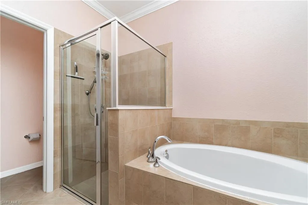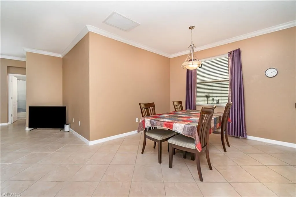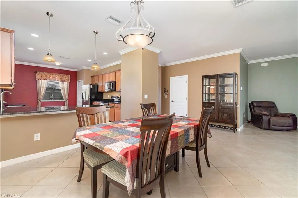 Welcome to the gated community of Promenade West at The Forum. Step inside this 3-bedroom 2 bath beautiful home and you will discover many features including; volume ceilings, tile throughout the living areas, baths and laundry room, laminate flooring in the bedrooms and crown molding can be found in the primary bedroom and living areas. The large eat in kitchen with granite counter tops features a pantry closet, mostly stainless appliances & a breakfast bar adjoining the dining room and living area with slider to the lanai. The primary suite features a walk-in closet and En Suite Bathroom with a garden tub, shower, dual sink vanity and linen closet. Two guest rooms are located off the great-room with easy access to the guest bath and lanai. The inside laundry room with newer washer/dryer leads out into the attached garage. A few of the many updates to this home are a Whole House Filtration System (2019), AC system (2019), water heater (2018), Garage door opener system (2023), the outside of the home was painted in 2020, Leaf Filter Gutters installed (2022) and the lanai screens and screened door were replaced in July of 2025. Low HOA fees and no flood insurance required. No power loss during storms as home is located on the hospital grid!