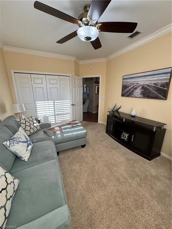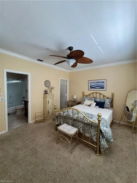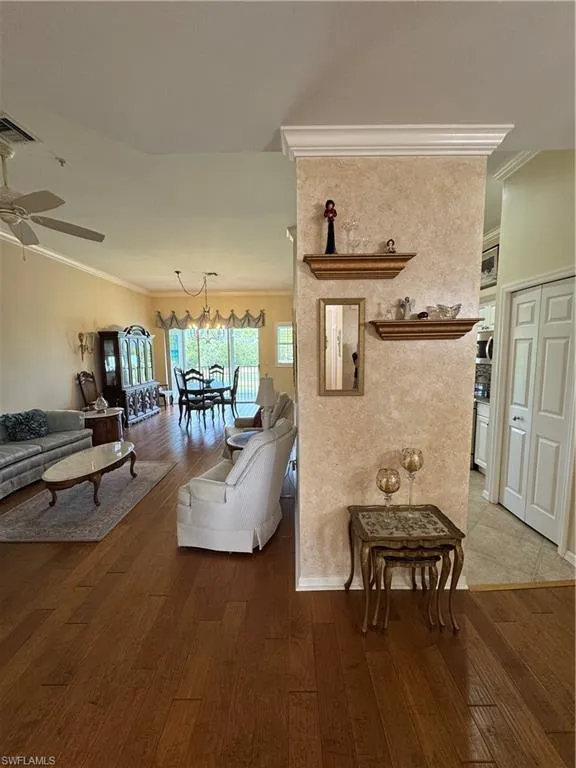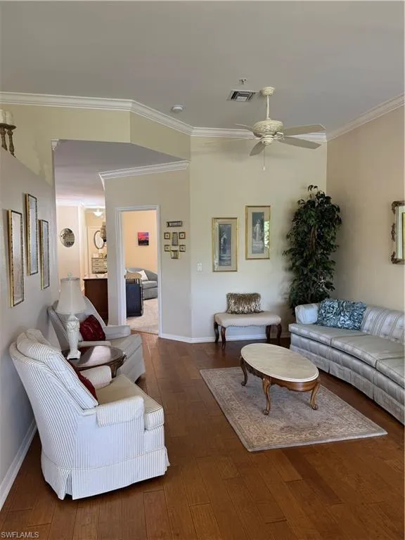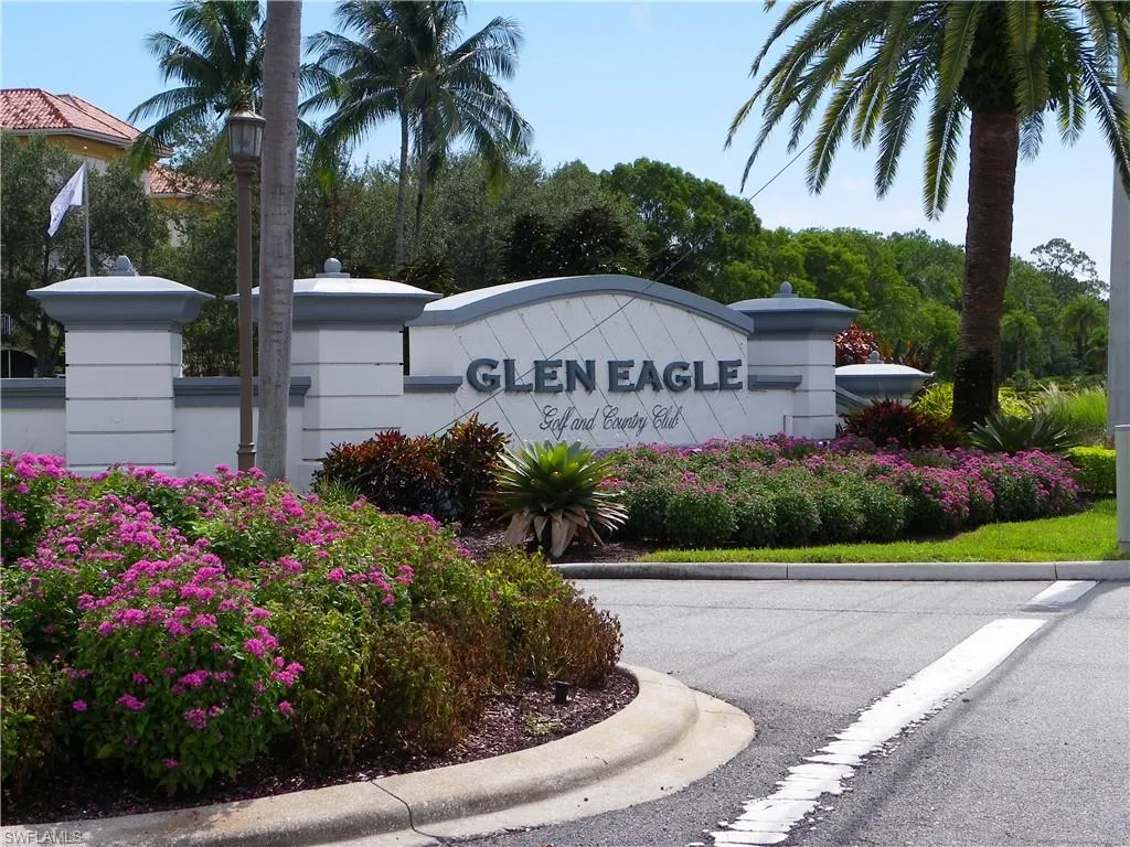 Luxurious coach home with gorgeous settings in Glen Eagle Golf and Country Club, featuring a full deeded golf membership, cable, internet, water, sewer, common grounds landscaping, outside building maintenance, and other amenities currently included in the Glen Eagle master association’s semiannual dues. Enjoy plantation shutters, crown molding, updated AC & water heater, Lanai storm shutters, hand scraped wood floors, & garage with overhead storage. American Home Shield warranty policy provided for a period of time, inquire about details. Total under air sq/ft of 2088 with total area 2525 sq/ft. This home has cathedral ceilings, 3 bedrooms, magnificent sunsets, screened lanai, and a spectacular master suite with stunning bathroom. Feel like you are in a one-of-a-kind resort. Updated guest bath & kitchen, no detail has been missed. This bundled Glen Eagle community has an 18-hole golf course, tennis courts, pickleball, bocci, clubhouse with restaurant, fitness center, active social calendar, and pools. The neighborhood, Glenmoor Greens II, has additional amenities included in their association. Move right in and begin your journey, as most of the furniture and wall hangings, within the unit, are included. This turnkey property is designed for luxury, unique, with close proximity to beautiful beaches & downtown Naples. Must see opportunity, a rare gem.