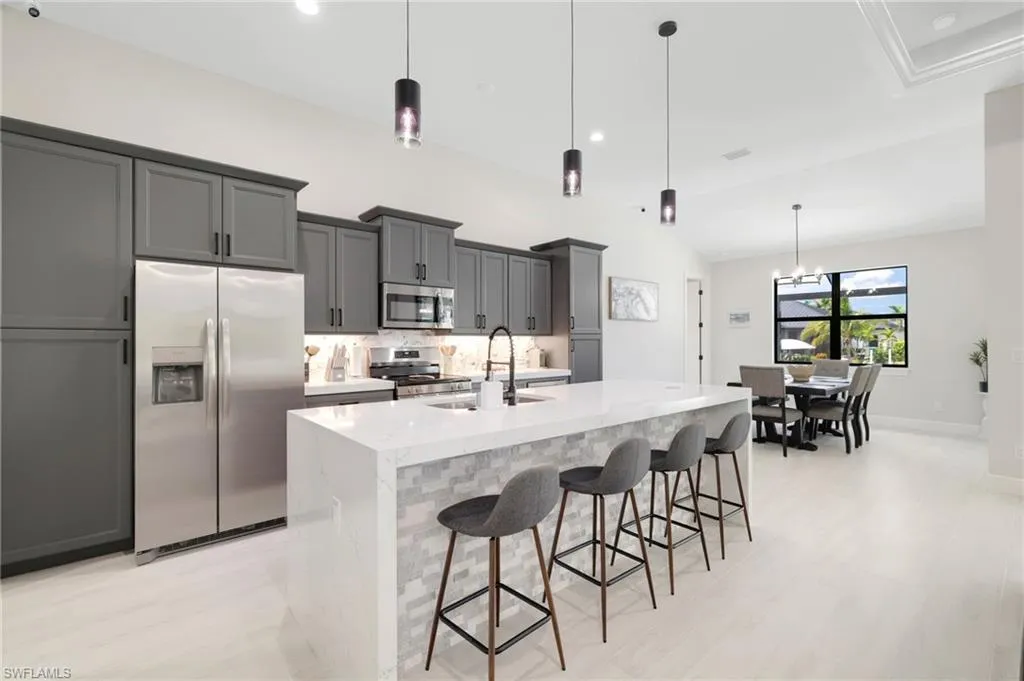 Modern Waterfront Masterpiece in NW Cape Coral!!! This Gulf access property offers 4 bedrooms, 3 bathrooms, and 2,031 sq. ft. of open living space with lighted tray ceilings and designer finishes throughout. The gourmet kitchen is a showstopper, featuring Cambria quartz waterfall countertops, sleek cabinetry, and modern lighting. The outdoor living area is perfect for entertaining, complete with a heated pool and spa powered by a Pentair system, full outdoor kitchen, and picture frame-screened lanai overlooking wide water views. Boaters will love the direct Gulf access, private dock, and 14,000-lb boat lift. Additional upgrades include a Sonos surround sound system wired to the living room, bedrooms, and lanai, plus a premium home security system for peace of mind. Located in one of Cape Coral’s fastest-growing areas with new construction and exciting growth, this move-in ready home combines modern luxury, smart features, and the ultimate Florida waterfront lifestyle.