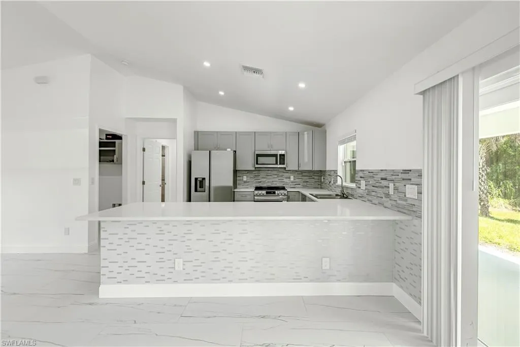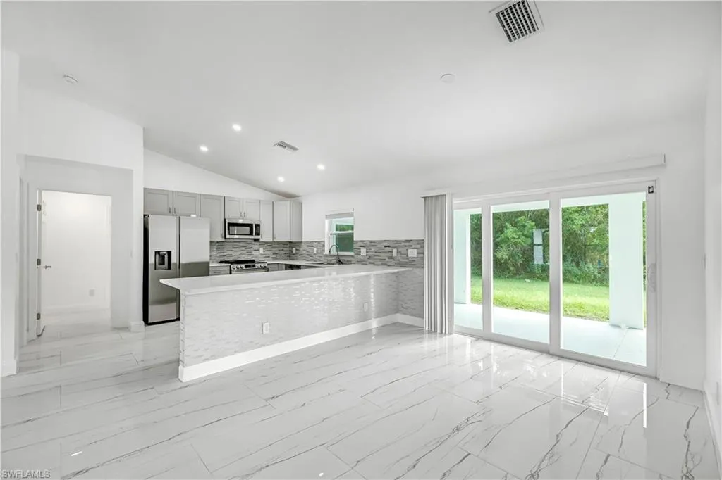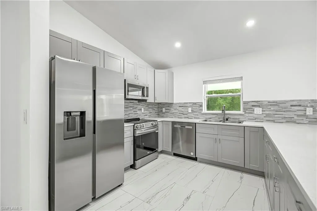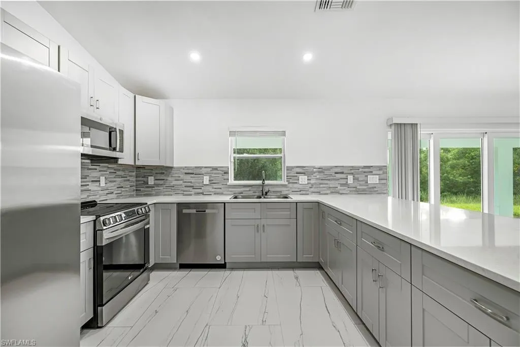 The kitchen is a chef’s delight, featuring stainless steel appliances, sleek gray cabinetry, and quartz countertops. The spacious master suite includes sliding glass doors to the lanai and a walk-in closet.