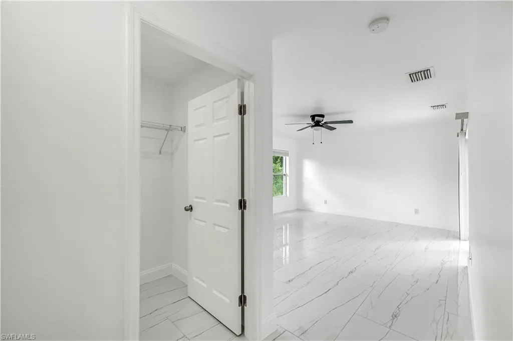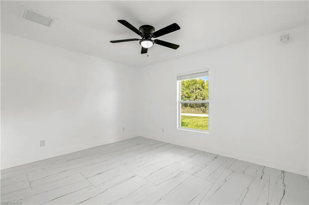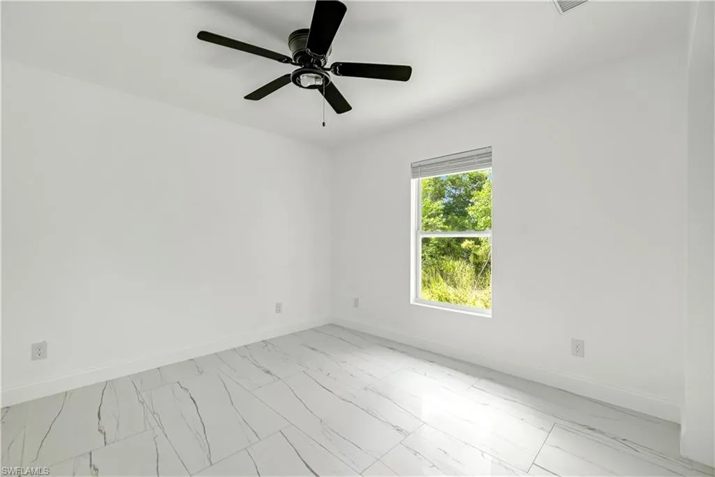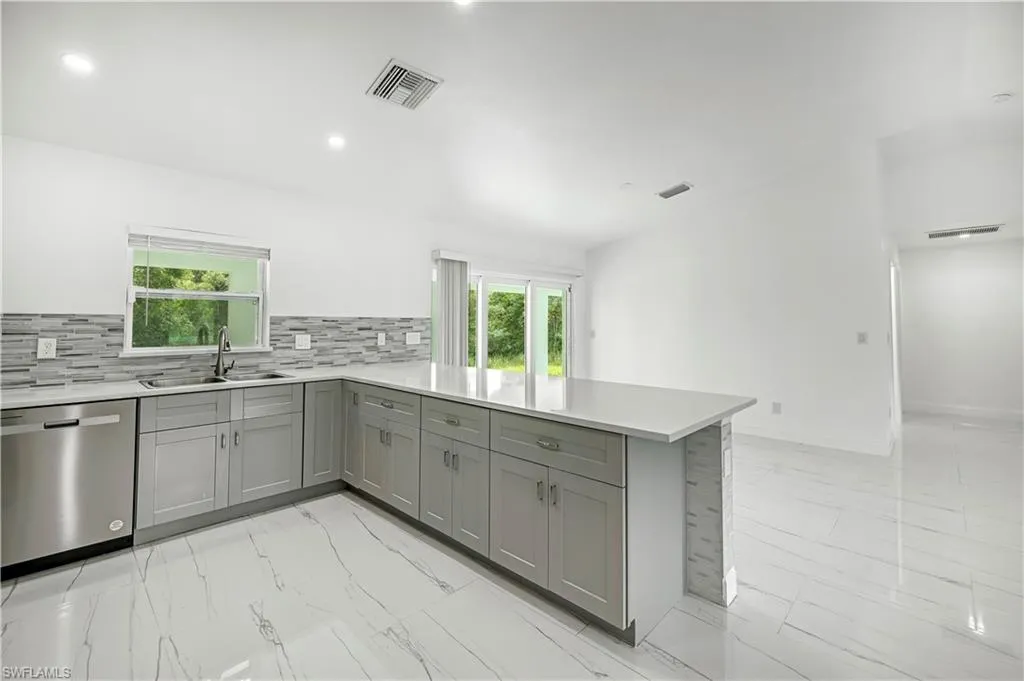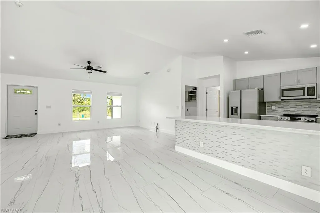 The kitchen is a chef’s delight, featuring stainless steel appliances, sleek gray cabinetry, and quartz countertops. The spacious master suite includes sliding glass doors to the lanai and a walk-in closet.