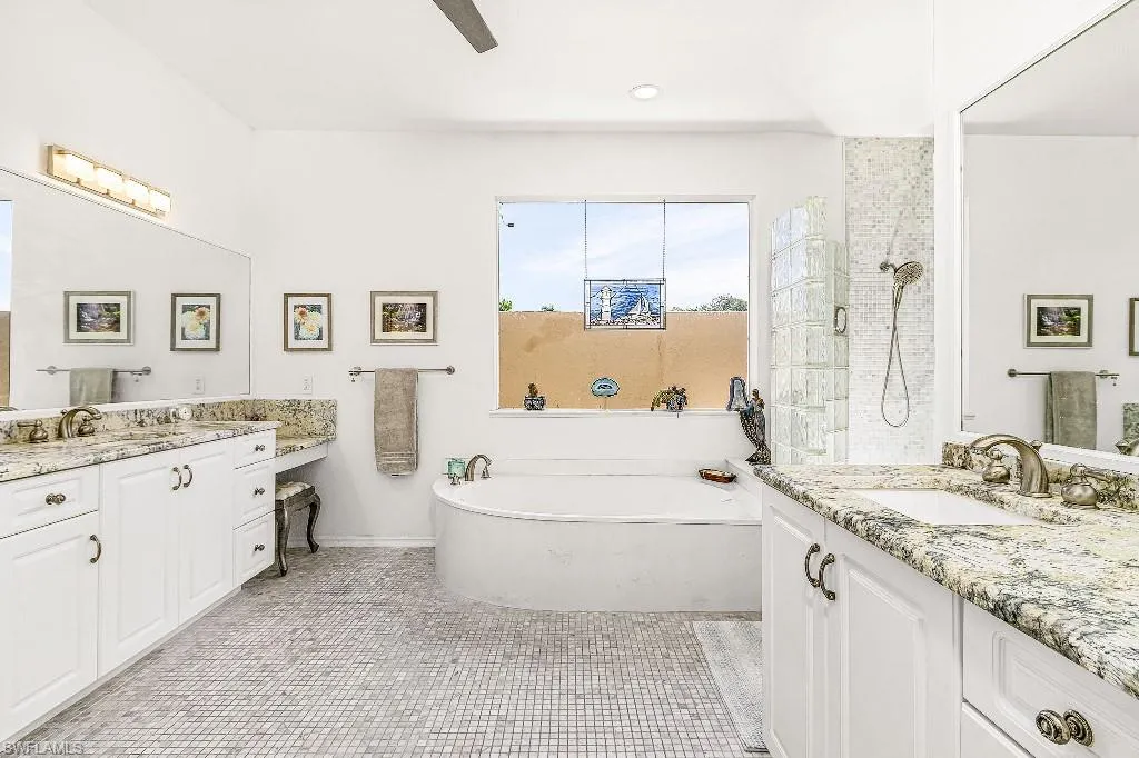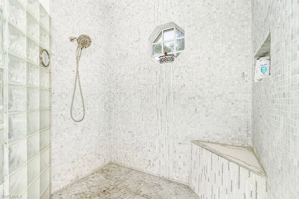 master bath is done in marble mosaic tile with walk-in shower, white cabinetry with