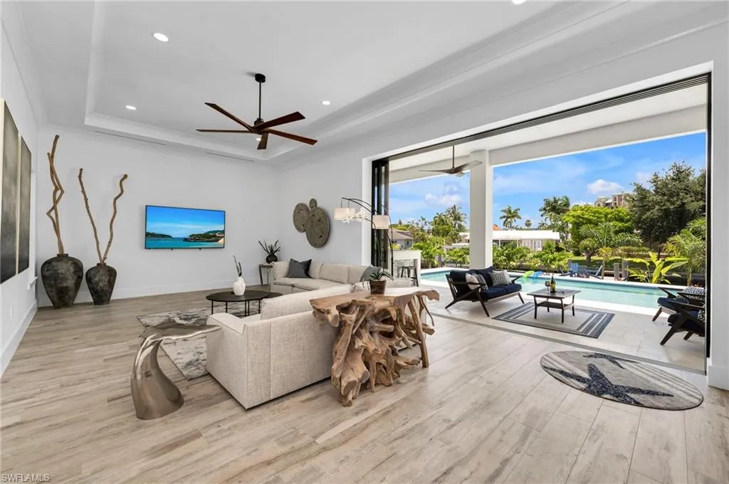Inside, light-filled living spaces are framed by soaring ceilings, expansive impact-rated glass, and panoramic canal views. Designer wood-plank tile, sleek linear air vents, quartz countertops, and custom lighting reflect the attention to detail found throughout. The chef’s kitchen impresses with custom cabinetry, luxury appliances, and generous prep space, while multiple gathering areas make the home ideal for both intimate living and large-scale entertaining.