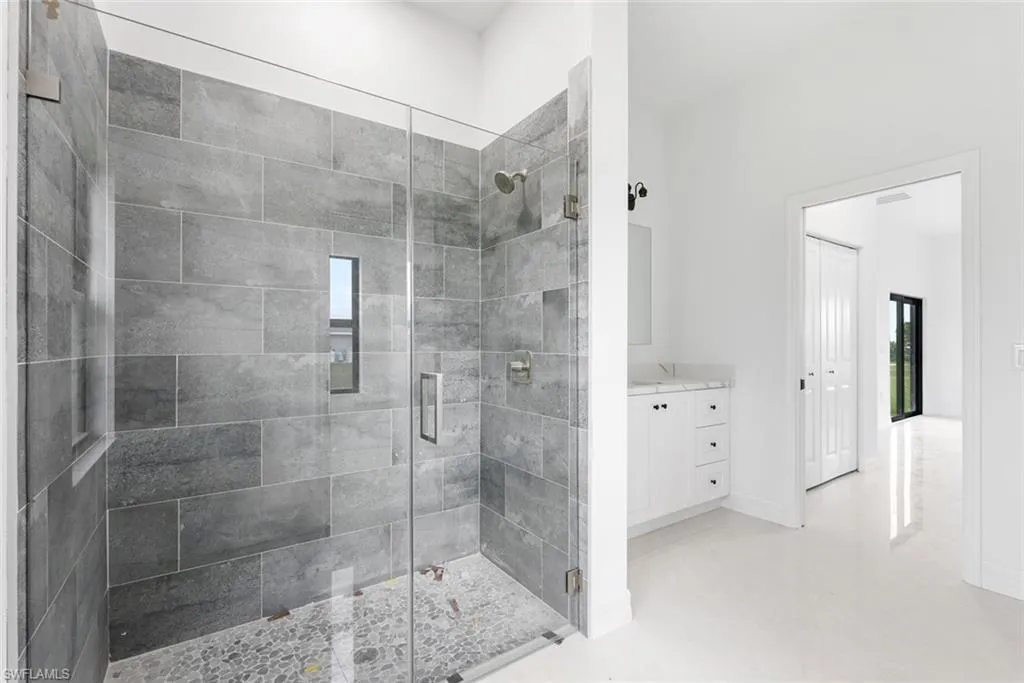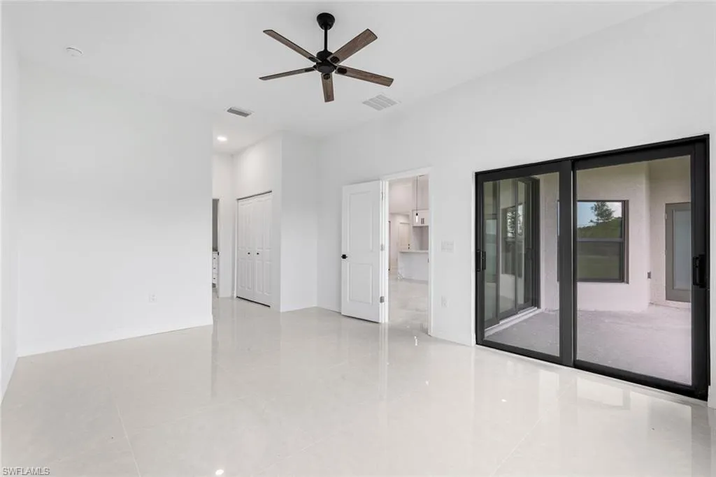 The kitchen offers a large granite island, contemporary cabinetry, and stainless steel appliances — perfect for cooking and casual dining at the breakfast bar. The master bedroom includes two walk-in closets, direct access to the lanai, and an ensuite bathroom with dual sinks and a spacious walk-in shower.