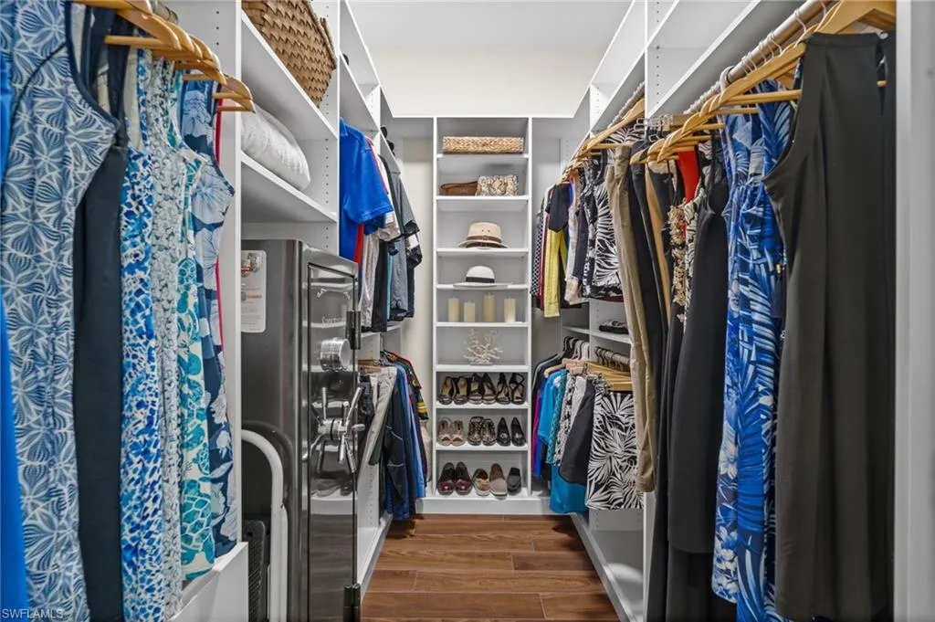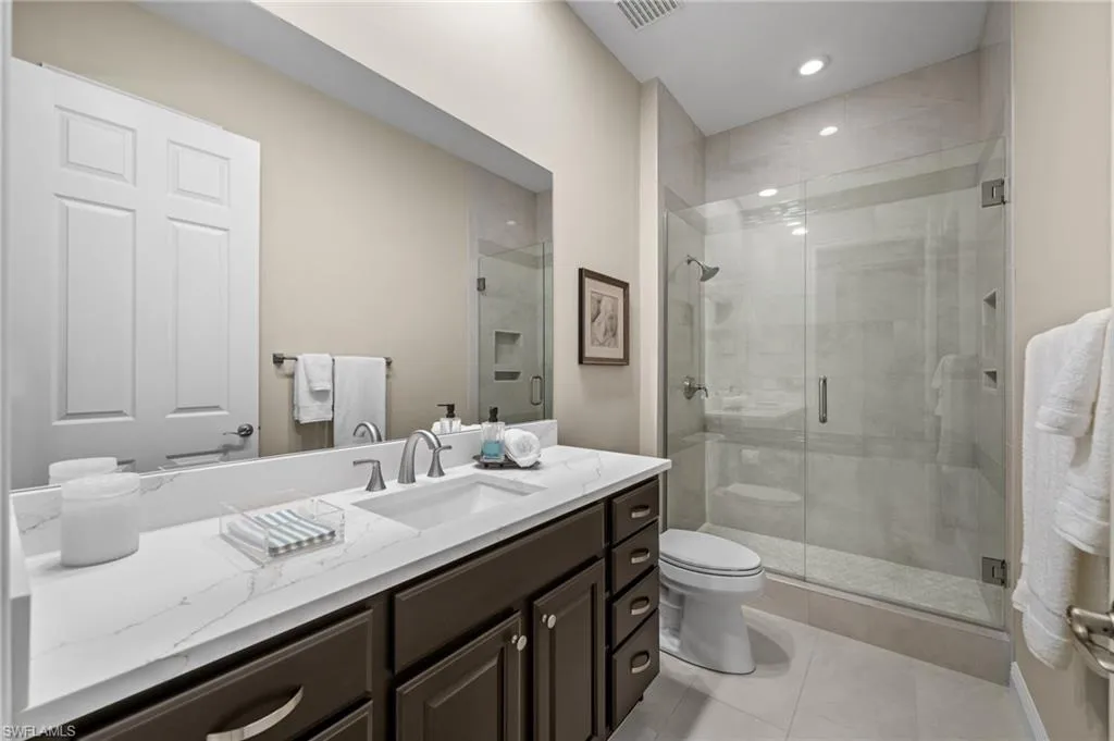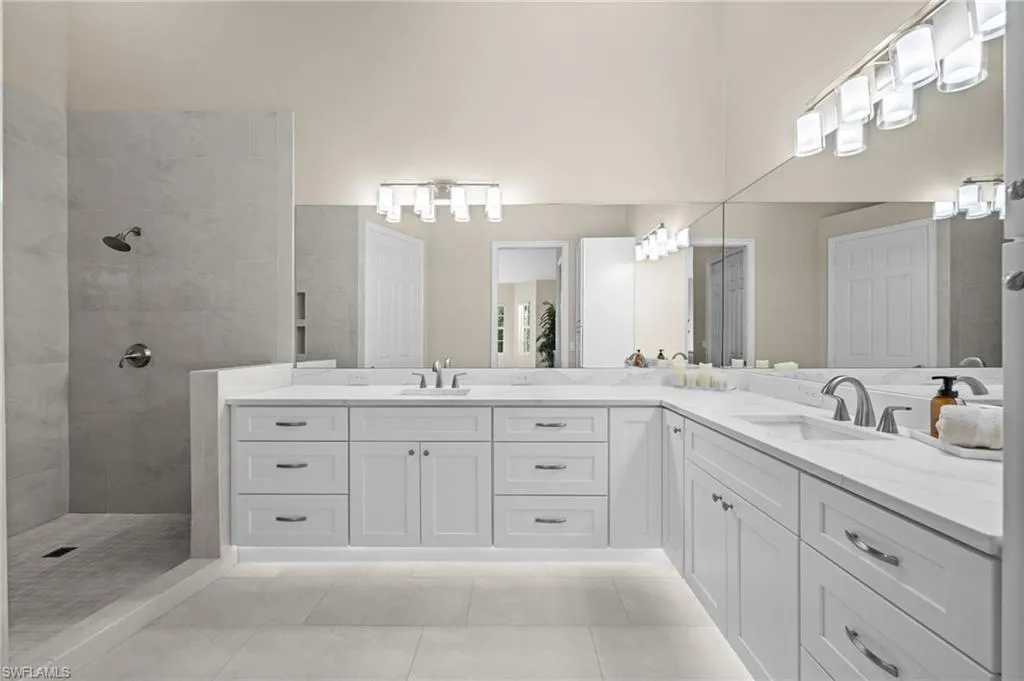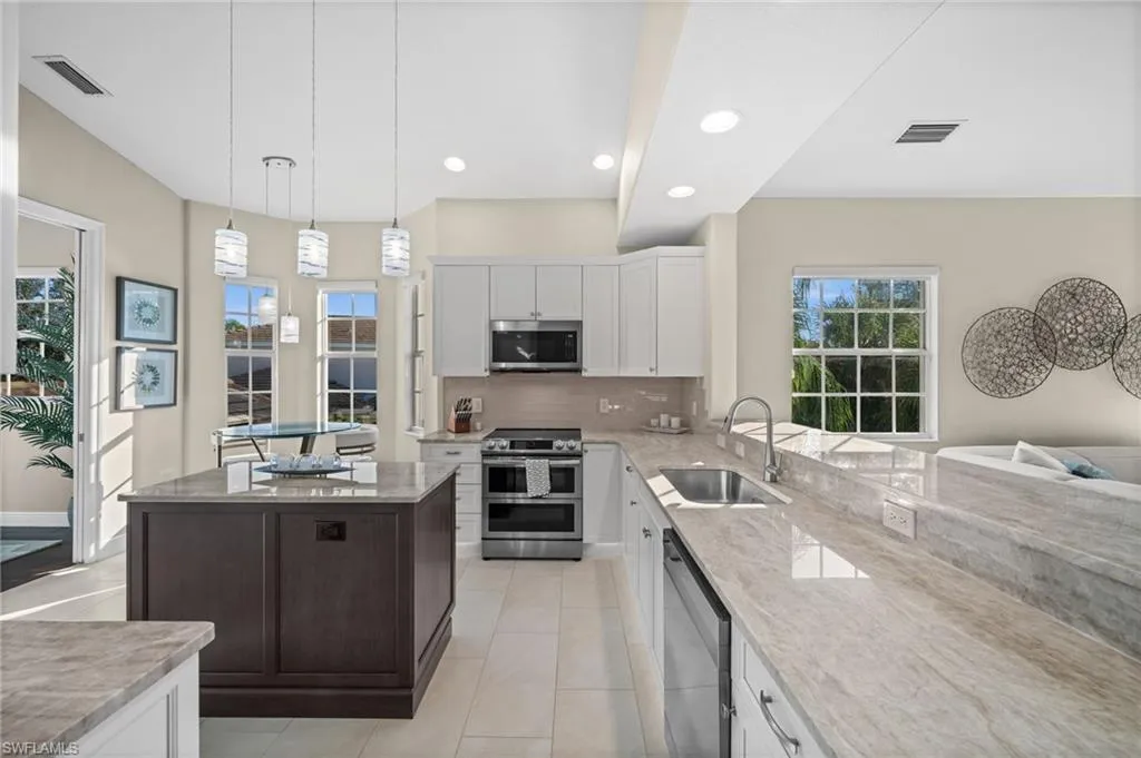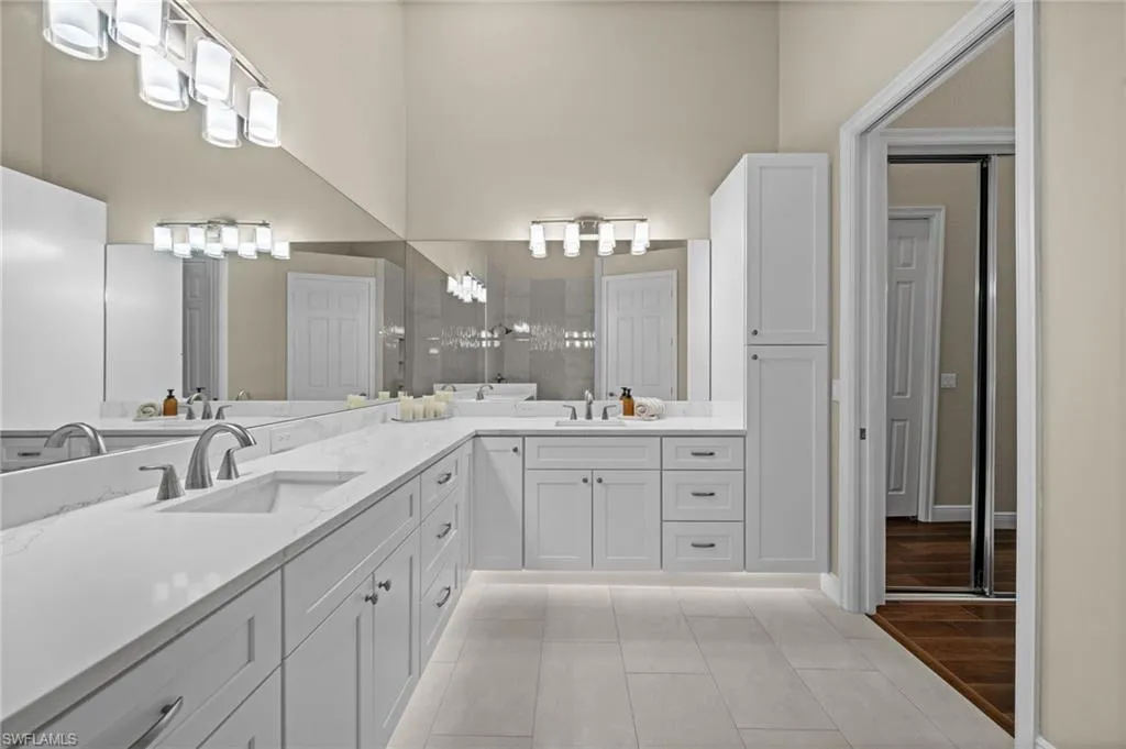 All original flooring replaced with exquisite porcelain tile throughout – marble-look in baths and laundry, wood-look in bedrooms and living areas, extending seamlessly to screened lanai and private elevator. Gourmet kitchen features custom frameless cabinets with soft-close doors and pullout shelves, stunning Taj Mahal quartzite countertops, glass tile backsplash, new kitchen island with drawer stack, stainless steel touchless sink/faucet, high-end Samsung appliances, sophisticated LED lighting above, under and around cabinetry. Master suite sanctuary boasts completely reimagined bath with enlarged doorless shower featuring waterfall accent, Kohler Forte high-flow fixtures, wrap-around mirrors, kitchen-depth cabinets even including a lazy susan, quartz calacatta countertops with dual square sinks, elegant toe-kick lighting, expansive master bedroom with bay windows and vaulted ceilings. Smart home features include WiFi thermostat, kelvin-adjustable LED lighting throughout, security on exterior doors, biometric keypad entry, upgraded cellular security system, tankless water heater, whole-house water softener and filtration system. Enjoy a completely customized laundry room with custom cabinetry, high-end Samsung washer/dryer with pedestals including mini units, enhanced garage with tiled floors, custom workbench, ceiling storage and WiFi opener. *** Living in San Marino provides access to 2 (!) exceptional clubhouses***: Your own San Marino clubhouse with catering kitchen, fitness room, pool, and spa, plus the award-winning Main Clubhouse on the sand beach with multiple restaurants! Your home is walking distance to the San Marino clubhouse. The famous Arthur Hills Signature Championship Golf Course is located in San Marino, Southwest Florida’s only Hills Signature design. Enjoy unmatched amenities including 3 miles of private white-sand beaches, marina, tennis, fitness centers, infinity pool, restaurants, and Miromar’s 700-acre freshwater lake! Shopping, dining, and entertainment complete the lifestyle. With its resort-inspired atmosphere, active social calendar, and over 200 awards, Miromar Lakes is the **#1 Community inhe USA and the only Florida community to win Gold Awards for both #1 Community and #1 Clubhouse from the National Association of Home Builders. Perfectly located just 2 miles from RSW Airport, minutes to I-75, and across from Gulf Coast Town Center. Resort amenities include European spa, 50-seat theater, beachside dining, tennis, pickleball, bocce, two marinas, and state-of-the-art fitness center – all outside designated flood zones. San Marino offers incredible benefits, endless recreation, and an unmatched luxury lifestyle!