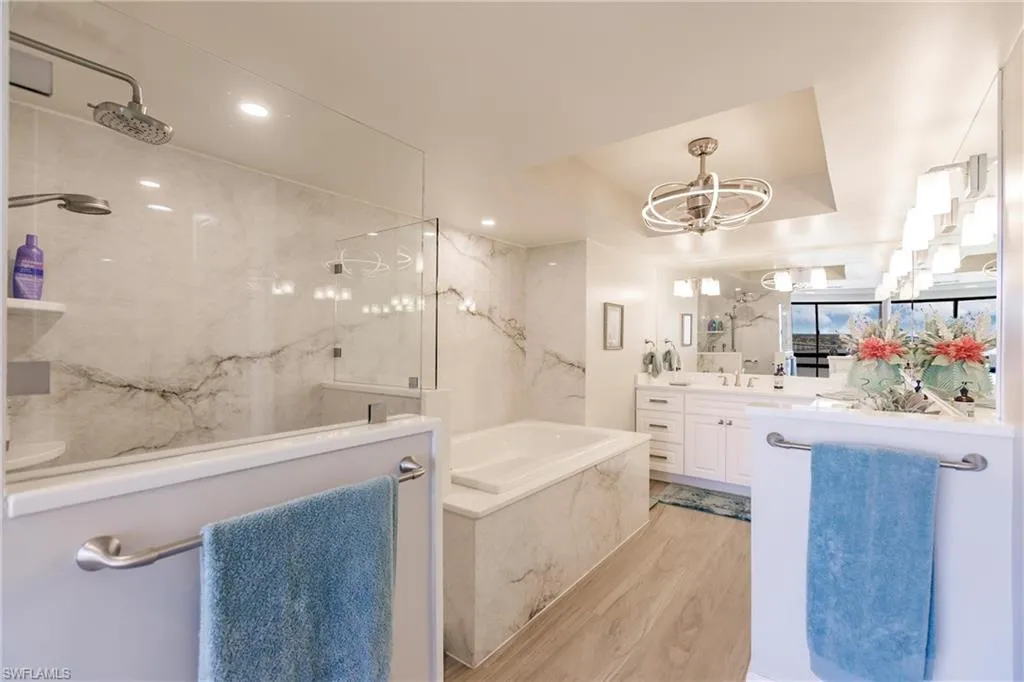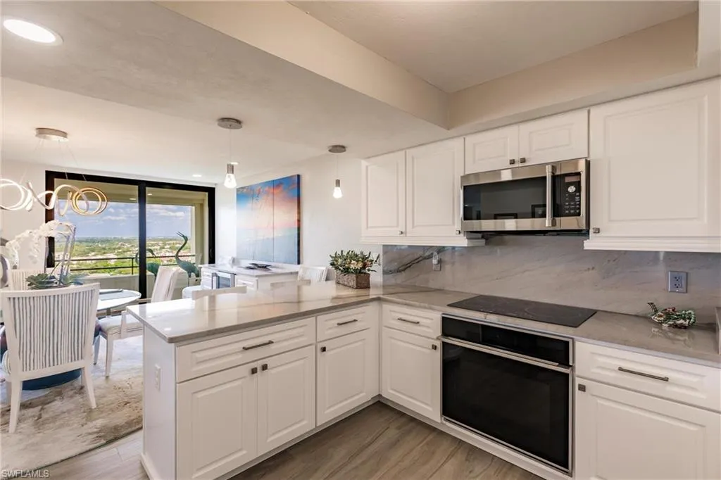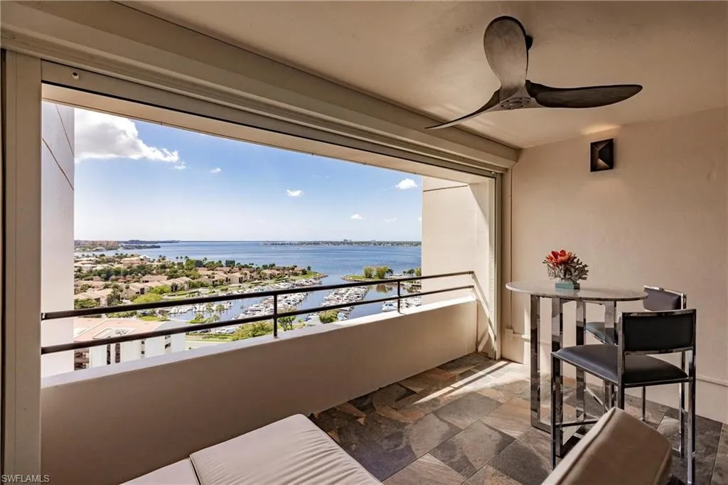 This SPECTACULAR 3-bedroom 15th floor corner ‘sky home’ with incredible views has been upgraded to the fullest! Over 2,500 sqft of luxurious elegance, this coastal-themed property with designer details will captivate you! High-end features of plank tile flooring, a completely renovated kitchen with gorgeous quartz, custom cabinetry, upscale appliances and ample storage. Each of the 2-1/2 baths have been fully renovated w/amazing tile, glass and wood. The huge primary suite w/balcony on the southwest side of the home provides colorful views to Sanibel and the barrier islands. The expansive 60+ ft long main balcony provides outdoor enjoyment and entertainment space with river views as far as downtown Fort Myers. NEW hurricane doors and windows, plus Storm Smart screen protection and new dehumidification unit assures peace of mind. Membership has its privileges, and you get it ALL with this property. Located in The Landings Yacht Golf & Tennis Club, this gated & bundled community has “Best in Florida” tennis and pickleball associations with free access to 16 clay courts and 8 pickleball courts with many different levels and divisions and play. Golf on 18 holes with leagues and open play. Well-equipped sports Pro shops. Deep water Gulf access marina with INCLUDED boat slip for up to a 65’ vessel (subject to wait-list), with a Ship’s store and fuel dock. Top it off with lots of social activities and 2 great dining venues. Owners in Ariel, a luxury high rise atrium-style condominium, enjoy fabulous amenities of 4 guest suites, fitness center with locker rooms and saunas, resort swimming pool and BBQ plaza, gaming and card-playing rooms, ball room/function hall and 3 tennis courts. In addition, under building parking, storage lockers and on-site management complete this amazing package. A great opportunity awaits – come embrace this tropical, fun and luxurious lifestyle!