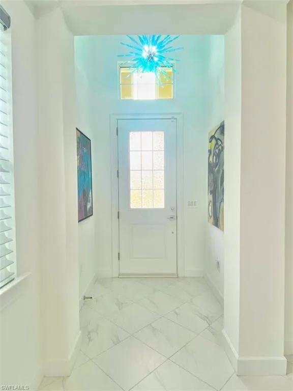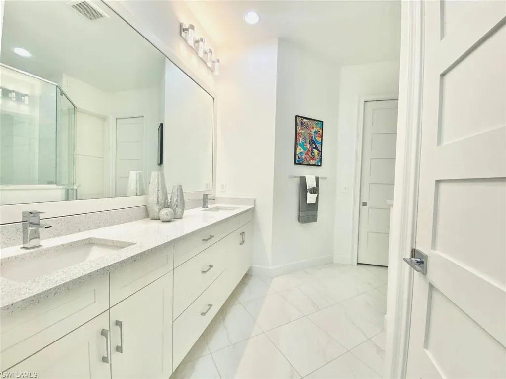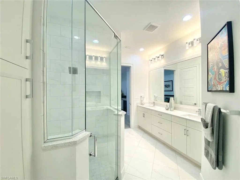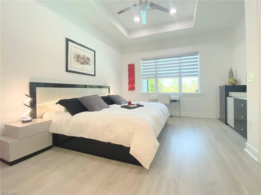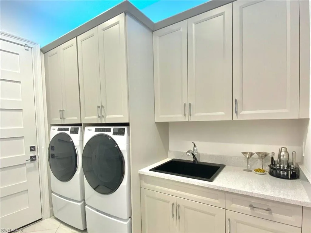 This 2,366 sq. ft. villa, located in a no-flood zone, radiates luxury: soaring 10’–12’ double tray ceilings, an 85” custom TV wall, impact-resistant windows and doors, designer lighting and fans, quartz countertops, top-tier flooring (no carpet), custom motorized blinds, security system with wall safe, and motorized lanai storm shades. Even the laundry room has been elevated with a granite sink, custom cabinetry, and front-load washer/dryer on storage pedestals.