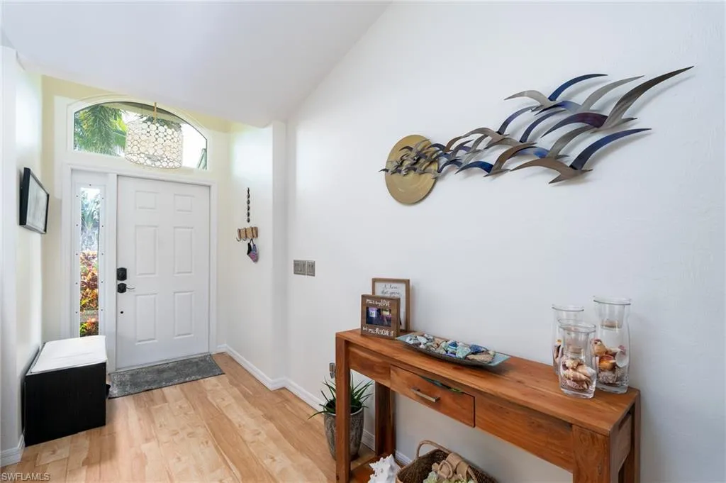 Rarely available and ideally tucked away on a quiet cul-de-sac, this 3-bed, 2-bath home rests in the deed-restricted community of Hampton Lakes. With a wide lake as your backdrop, framed by lush tropical landscaping and swaying palms, you’ll enjoy exceptional privacy — no neighbors behind and unchanging lake and nature views. The open-concept interior features a newer 2018 roof and soaring cathedral ceilings that enhance the open, airy feel. The kitchen is designed for everyday living with a pantry, built-in desk, and a reclaimed wood accent wall at the breakfast bar that brings a touch of warmth and character. The primary suite features dual sinks and a walk-in shower, while a pool bath provides easy access for guests enjoying the outdoors. Outdoors offers a spacious screened lanai with a tongue-and-groove ceiling that frames the sparkling pool, while an exterior deck offers the perfect setting for al fresco dining overlooking the lake. Both spaces combine to create a private retreat designed for Florida living at its best. This rarely available gem combines comfort, natural beauty, and a sense of discovery—all in the quiet setting of Hampton Lakes, one of Fort Myers’ best-kept secrets.