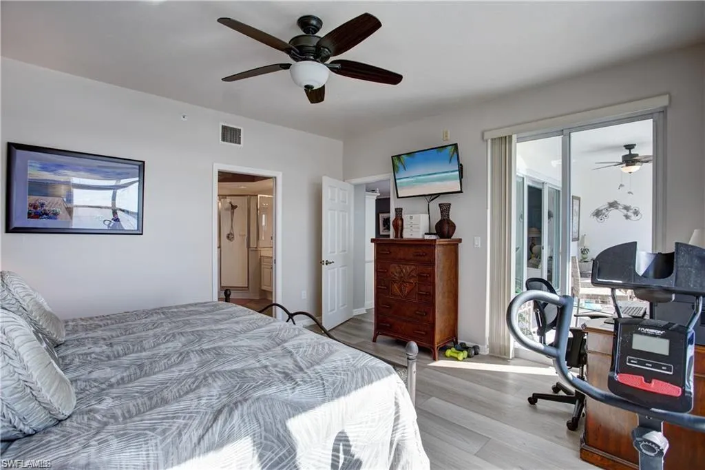 ~The spacious Primary Bedroom, complete with Impact Window (2024), sits on the bay with wonderful views to wake up to, sliders out to balcony, & large walk-in closet. The Primary Bathroom has a separate water closet with new toilet, shower with glass shower door, and 2 vanities/sinks.