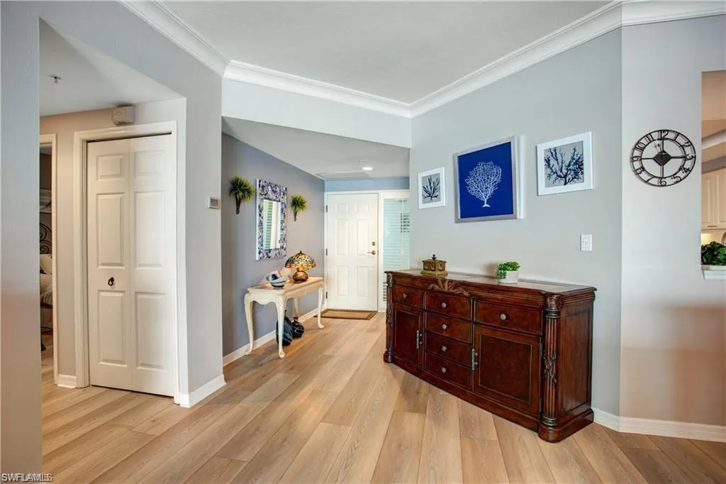 ~This freshly painted, 2 bed/2 bath, spacious condo is 1555 sf under air with a large tiled balcony for a total of 1768 sf, and boasts several updates including Core-Tek Luxury Vinyl Flooring throughout, all new Ceiling Fans/Lights, Chandelier, Blinds, Plantation Shutters, Crown Molding, newer Hot Water Tank (2020), and Wi-fi Thermostat (2023). The furniture in both bedrooms is included!