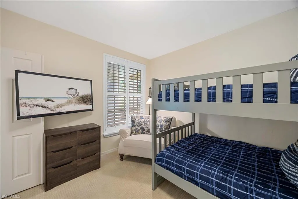 Welcome to this residence at 24420 Reserve Court Unit 103 in Bonita Springs. Offering three bedrooms, two baths and 1,657 square feet, this home features an open kitchen overlooking the golf course and preserve, complete with a stainless steel refrigerator and dishwasher replaced in 2022. A laundry room with sink, washer and dryer, also replaced in 2022, adds convenience. The renovated primary bath enhances the private retreat. The residence is fully furnished, with televisions in the living room and all bedrooms. One guest room includes a double bunk bed accommodating up to four adults. The screened lanai and lush patio provide additional outdoor living with golf course and preserve views. Constructed of concrete block, the building is part of a 60-residence community. Amenities include a renovated pool and spa, fitness room, outdoor kitchen with two stainless steel grills and an outdoor shower. A single attached garage is included.