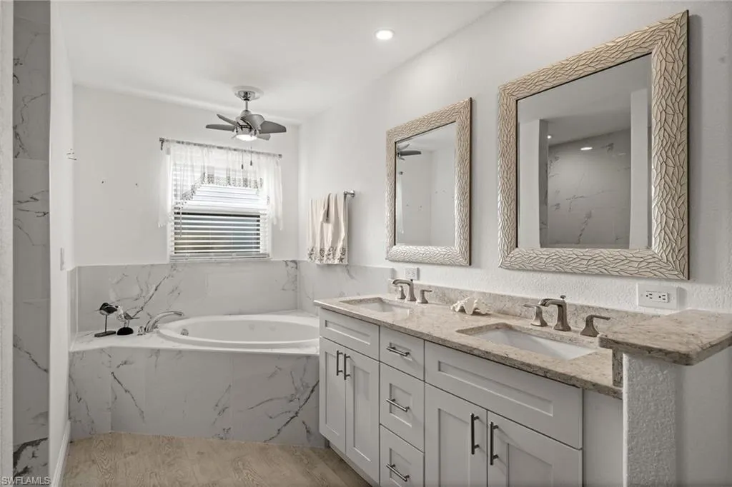 Florida Living at Its Finest! Remodeled 4-bedroom, 3-bath pool home with soaring ceilings and walls of natural light. Open-concept great room with split-bedroom layout and wood plank tile flooring throughout creates an airy, inviting flow perfect for everyday living and entertaining. The show-stopping kitchen features a dramatic quartz waterfall island, premium stainless steel appliances, custom wood cabinetry with pull-outs, and a sleek over-range hood—ideal for chefs and entertaining alike. The private primary suite is a true retreat with sliders to the lanai, a generous walk-in closet, and spa-style bath with walk-in shower, jetted soaking tub, and dual-sink vanities. Guest baths include beautifully tiled walk-in showers and quartz countertops. Outdoor living shines with a pool deck running the full length of the home, a spacious shaded area under truss on the lanai, sunny spots around the pool, and an additional pavered space perfect for BBQs, firepit, or outdoor dining. Set in a community surrounded by golf-access homes, this property combines leisure, lifestyle, and location. Additional highlights include an in-residence laundry room and new roof (2023). This home offers light, space, and the very best of Florida living—inside and out.
