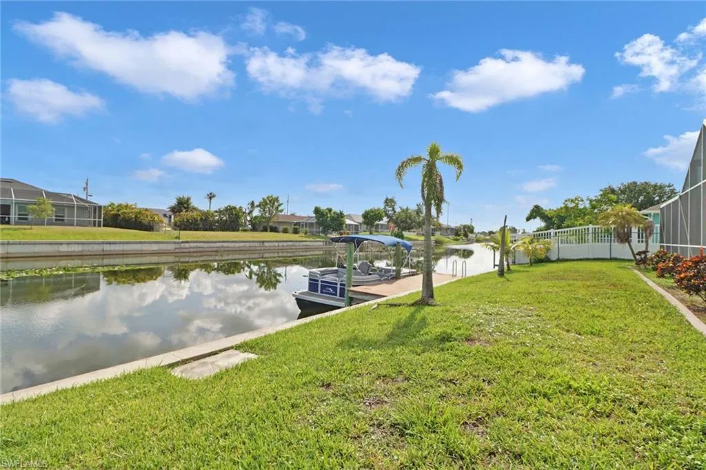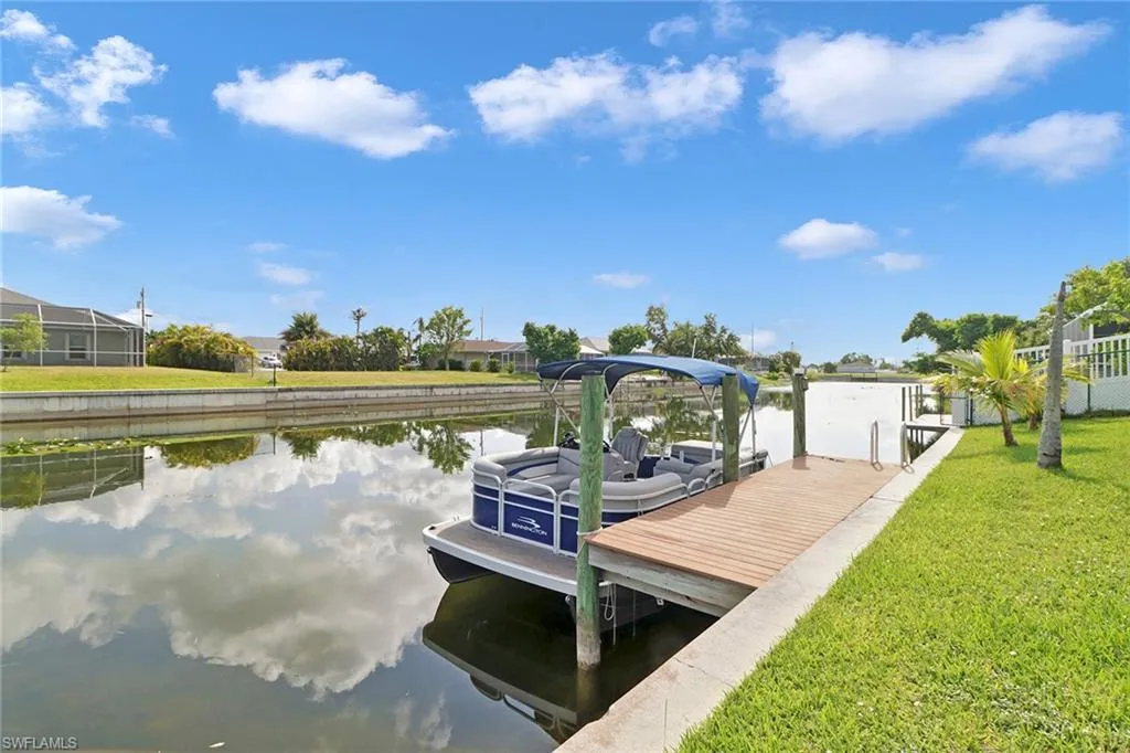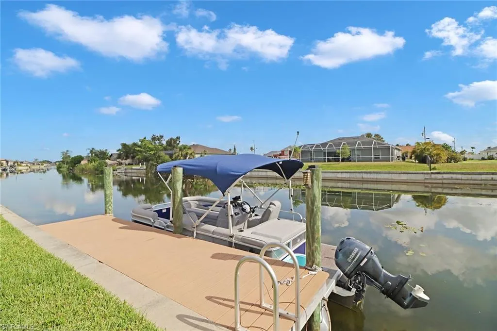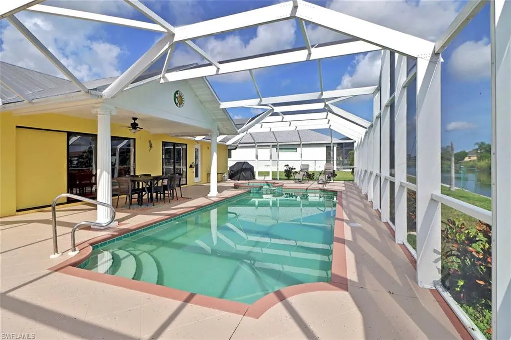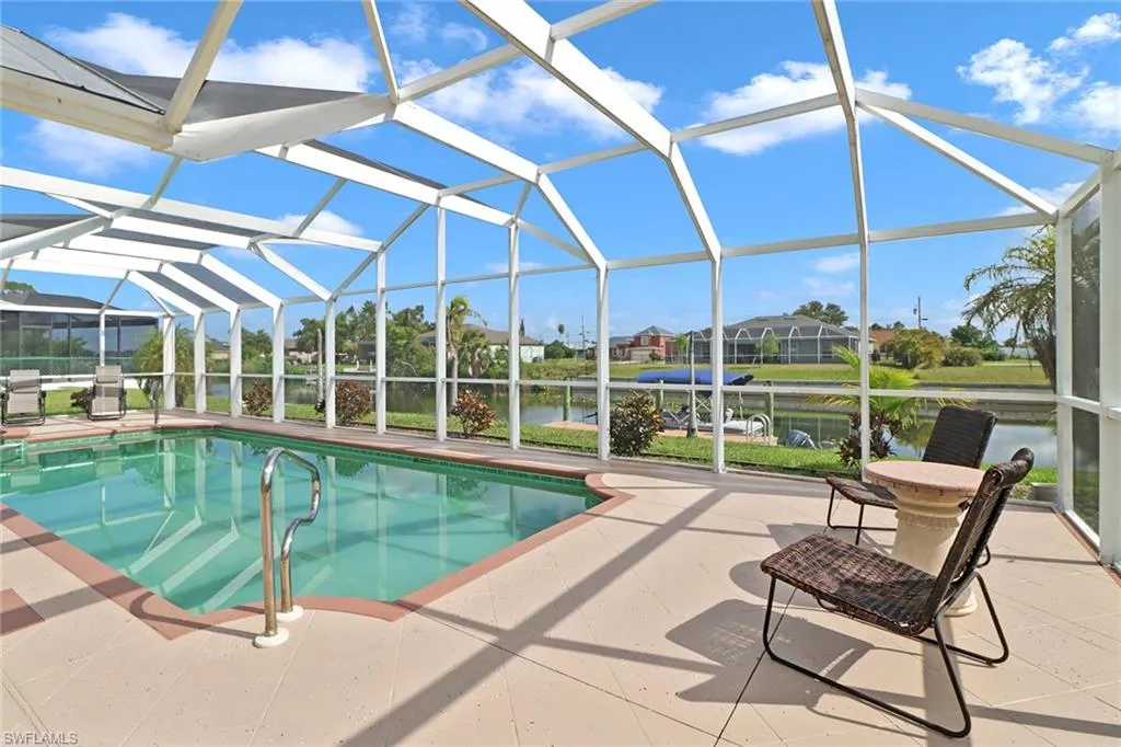 Welcome to this beautifully maintained turnkey 3-bedroom, 2-bath waterfront pool home with spa in desirable SW Cape Coral on a dead end road. Designed for both relaxation and entertaining, this home features a heated pool and spa, perfect for enjoying the Florida lifestyle year-round. Blending charm and security, you’ll find granite counter tops, Spanish tile, luxury vinyl plank flooring, central water and sewer (no assessments), and a durable metal roof for peace of mind. Situated on a canal that connects to Weatherly Lake, Alhambra Lake, and Lake Kennedy. This property offers endless opportunities for boating and fishing right from your private dock. All of this, just minutes from shopping, dining and everything Cape Coral has to offer. Come experience this incredible home today!