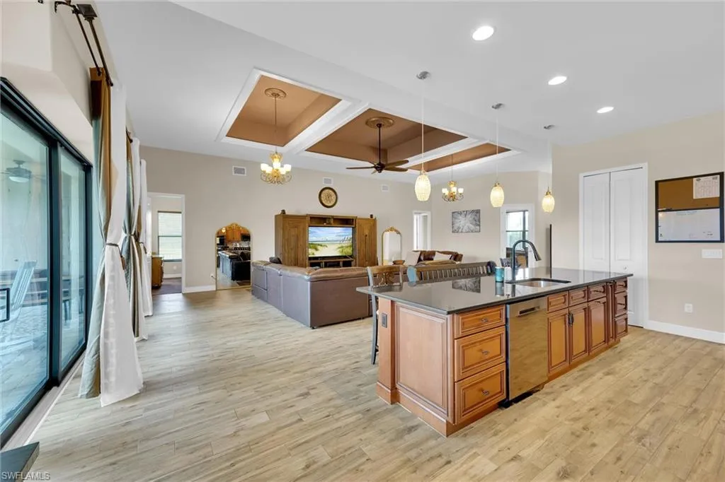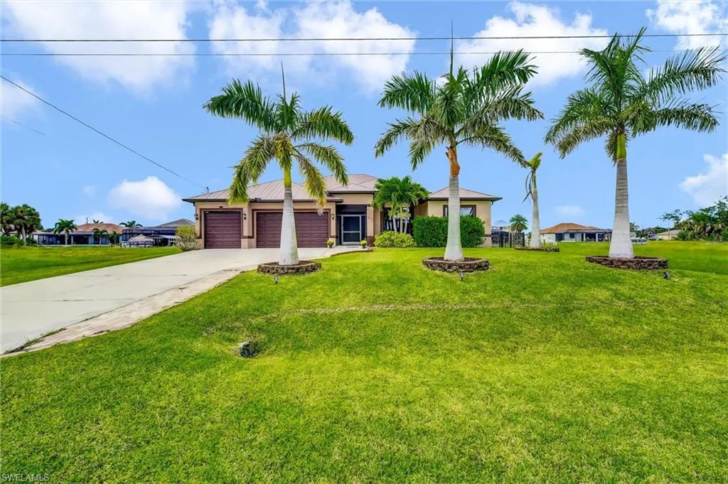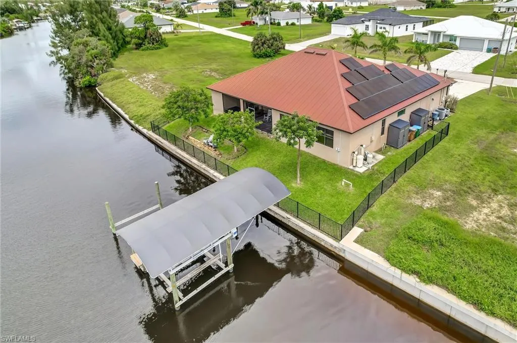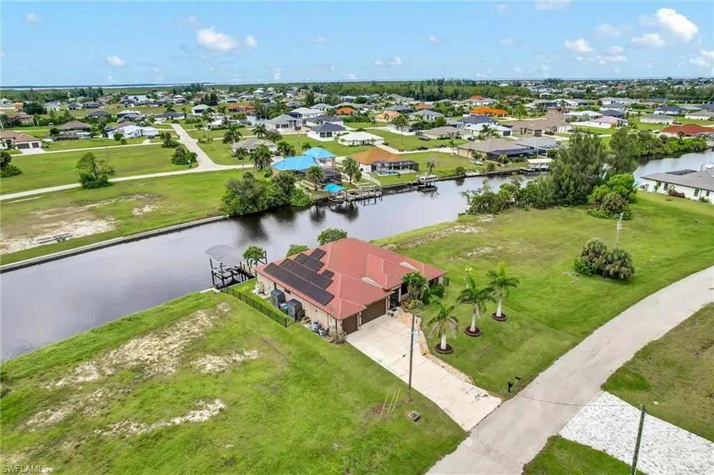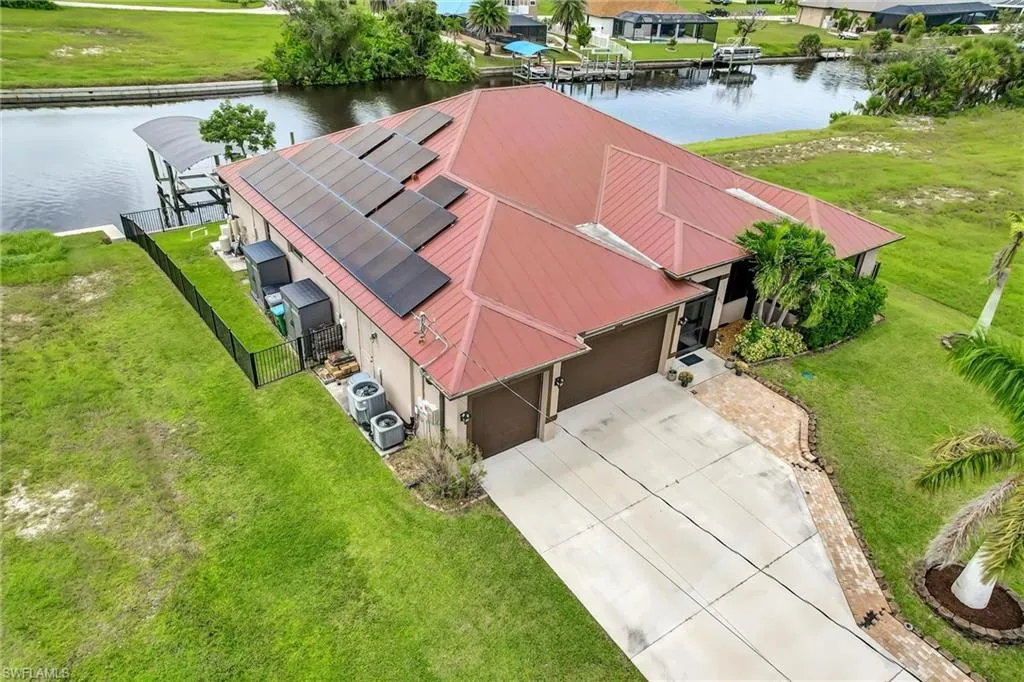 **STEP INTO THIS SPACIOUS HOME WITH OVER 2,800 SQ FT OF LIVING SPACE, NEWER CONSTRUCTION WITH METAL ROOF, 4-BEDROOMS-PLUS-DEN, 3-CAR GARAGE AND GULF ACCESS** that has all the perks of an enjoyable living space with waterfront access and views. You will certainly enjoy all the waterfront views and for all the boaters, revel in the 10,000-pound boat lift and dock that is ready to add a second boat lift right a way. Fishing from the backyard?? No problem! There are the likes of Snook, Tarpan and other variety of fish that you can catch right from the comfort of the backyard. The excitement continues with a quick boat ride to Matlacha and Pine Island which leads straight into open waters of the Gulf. Boat to Sanibel, Cayo Costa, Boca Grande, Charlotte Harbor, and more via the Matlacha Pass. Upon entering the high framed doors, you will be greeted with the wide-open concept of the spacious great room that boasts the highest tray ceilings, wide view of the waterfront through the palatial sliding glass doors and to your left, an ensemble of beauty in the luxury designed kitchen. The private den offers the flexibility of a flex space OR make it into an extra bedroom OR an office. Wow…so many choices! The large living space does not stop there. The dining room screams entertaining and hosting of gatherings of family and friends while prepping all meals in the meticulously designed kitchen showcasing granite countertops and all-wood cabinets. Let’s not forget the deep pantry and a DOUBLE OVEN. Yes, DOUBLE OVEN!! All 4-bedrooms are masterfully spaced out with a split-bedroom Floor plan (Floor Plan available upon request) where you can sleep peacefully and not disturb others in the other bedrooms. Let’s talk about the bedrooms as this home comes with the rare floor plan of having two of the bedrooms are ensuite bedrooms. The sky is the limit with this home. Speaking of skies… imagine yourself sitting out on the deck or the covered lanai, overlooking the water and watching the sunset from the western rear exposure. You cannot get any better than this! Other amenities that you will absolutely love: 3-CAR GARAGE, IMPACT WINDOWS, SOLAR PANELS, PORTABLE GENERATOR WITH EXTERNAL HOOKUP TO THE HOME, CONCRETE BLOCK CONSTRUCTION, CEILING FANS THROUGHOUT, CONSTRUCTED 2019, MINUTES AWAY FROM BURNT STORE BOAT RAMP.