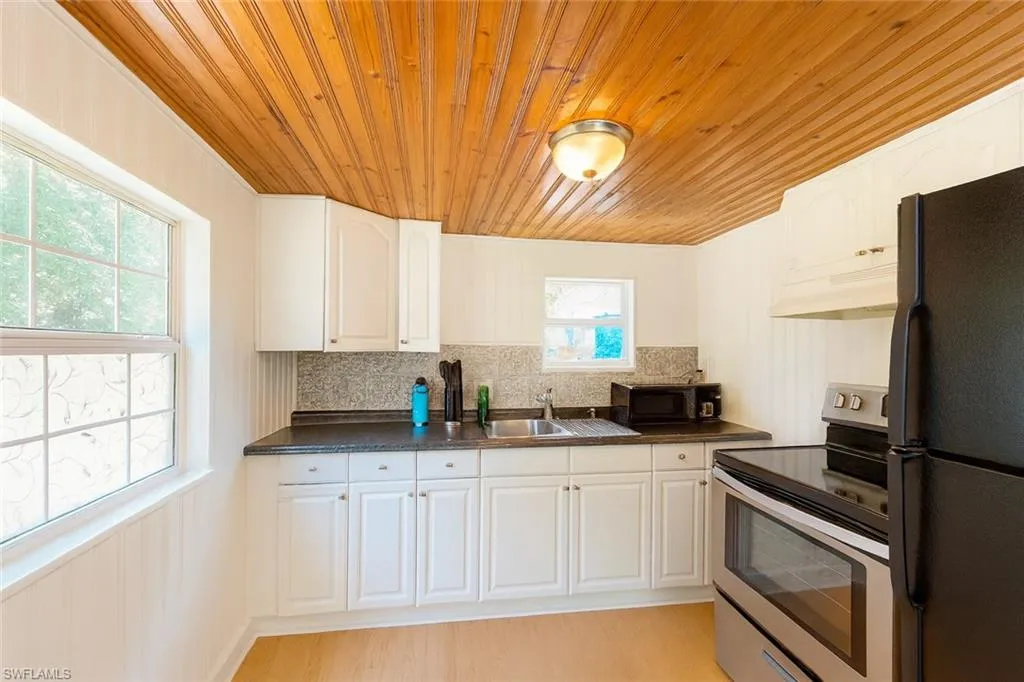 Step inside to a light and airy living/great room featuring a cedar wood ceiling, fresh interior paint, new laminate flooring, and an energy-efficient mini-split AC system. The updated kitchen includes white cabinetry, decorative tile backsplash, electric range, and matching cedar accents, making it both stylish and functional. A cozy dining room with wood ceiling, neutral colors, and a large picture window provides plenty of natural light for everyday living.