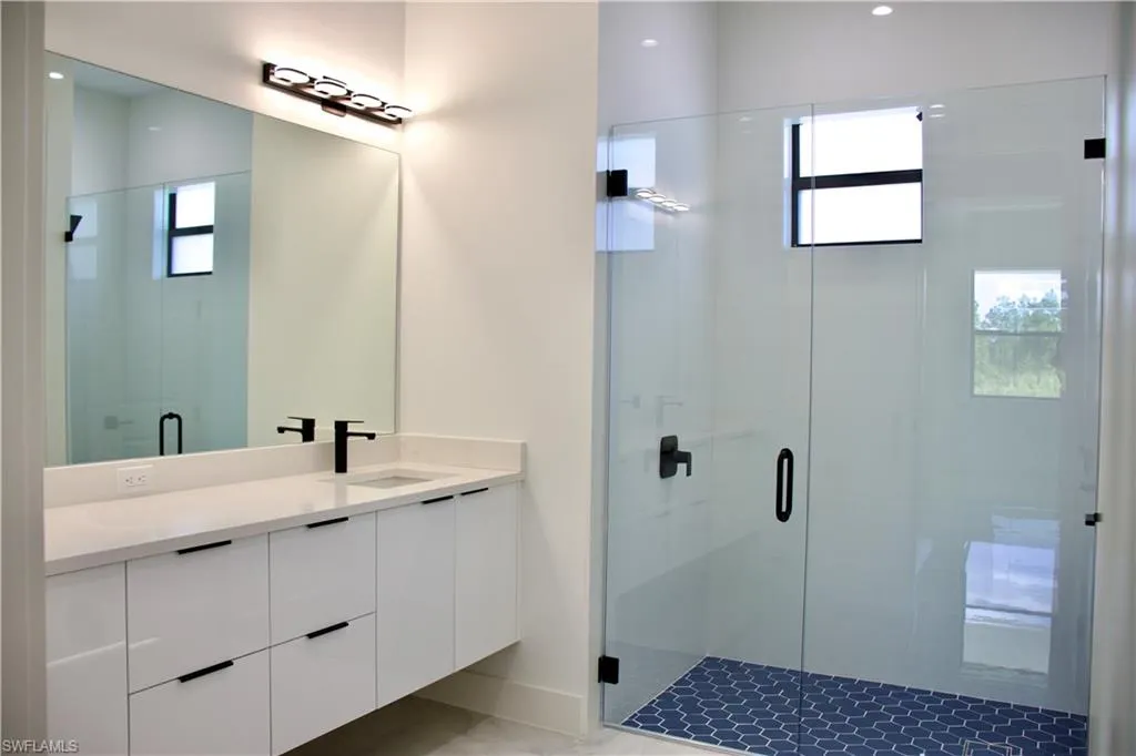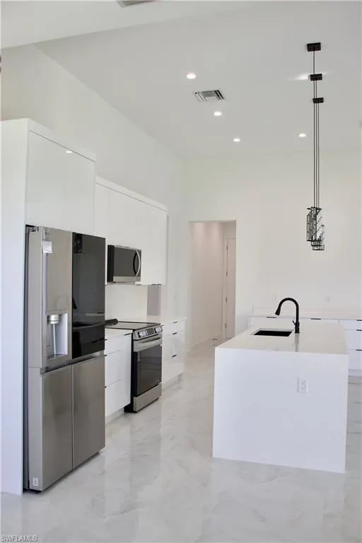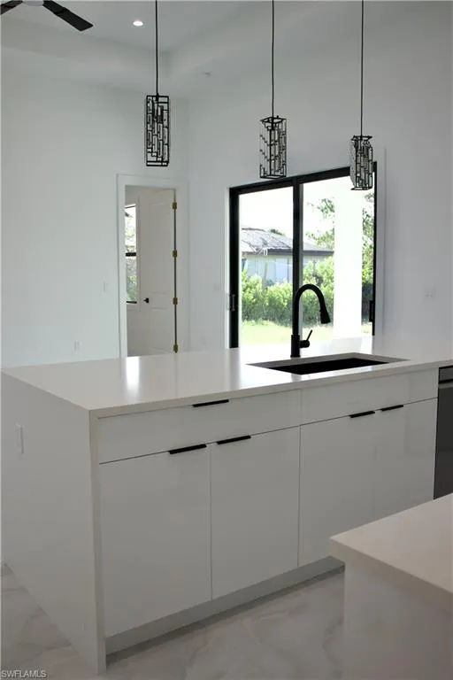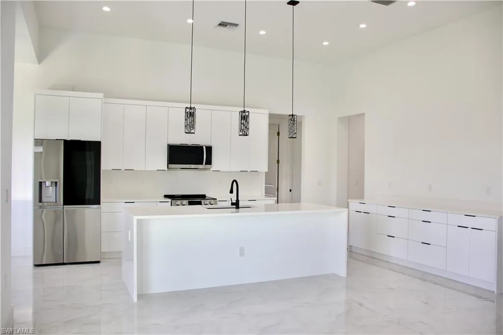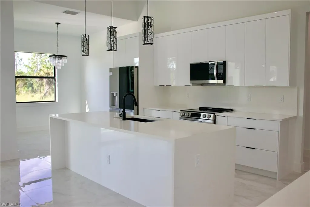 Stunning brand-new modern home situated on a spacious 1.59-acre lot. This open-concept design features 3 bedrooms 2 bath plus a den, soaring ceilings, and polished porcelain tile throughout. The kitchen boasts quartz countertops, a waterfall island, stainless steel appliances, and high-gloss cabinetry. The owner’s suite includes tray ceilings, a walk-in closet, and a spa-style bath with dual sinks and a large glass shower with beautiful blue and white tile. Enjoy outdoor living with a covered lanai area, perfect for entertaining or relaxing. Additional highlights include a den/flex space, epoxy-finished 2-car garage, asphalt driveway, laundry room with sink, and black-framed impact windows and doors. Plenty of room to add a pool, outdoor kitchen, or guest house all while enjoying the privacy of acreage living with easy access to shopping, dining, and main roads. This home is a rare opportunity to own a brand-new modern residence on a large private lot, combining the best of luxury living and peaceful surroundings.