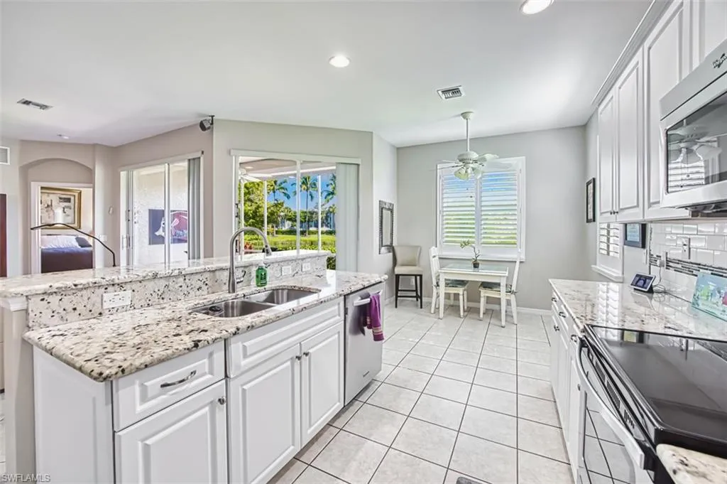 An open kitchen with breakfast nook leading to the screened lanai — ideal for enjoying the beautiful SWFL weather