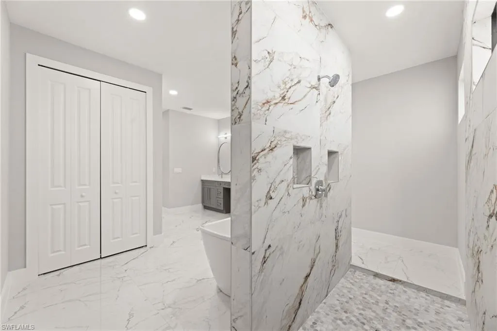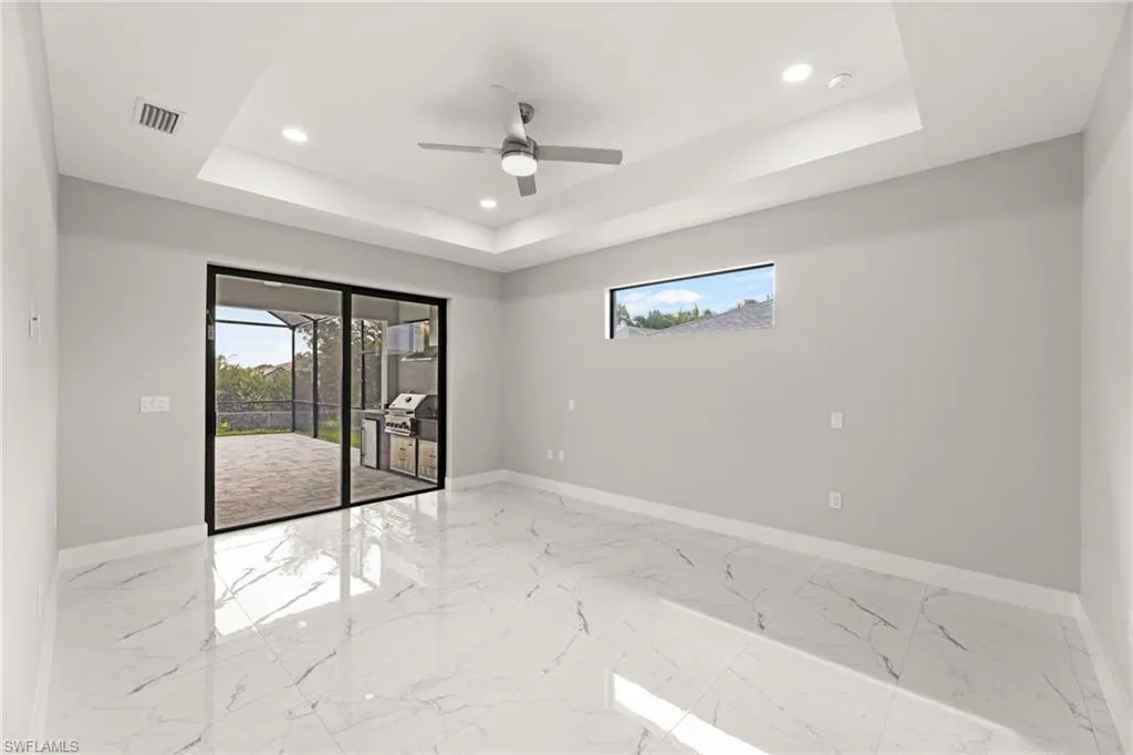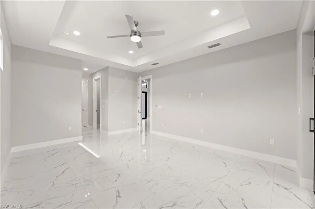 This NEW CONSTRUCTION home features 3 Bedrooms, 2 full bathrooms, a 2-car garage and 2,000 sq. ft. of living space – the primary bedroom has two large walk-in closets along with dual sinks, a freestanding tub with an elegant backsplash and a creative shower layout directly behind. There is a full-size pool bath with a standup shower and beautiful tile. The living room has 10ft coffered ceilings along with a custom built in TV enclosure with tile from top to bottom including an electric fireplace and a 70-inch smart TV (The enclosure can accommodate larger sizes). The entryway has 14ft cascading ceilings along with three large windows to offer plenty of natural light throughout the day.