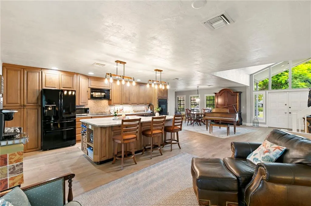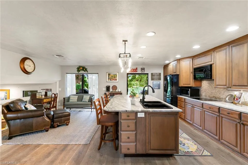 This inviting 4-bedroom split-level home showcases a spacious open floor plan highlighted by a large leathered granite island, the perfect centerpiece for gatherings and entertaining. Expansive windows overlook the wide lake view, while mature trees add shade and privacy, creating a peaceful retreat. Imagine enjoying Naples’ stunning sunsets over the water right from your backyard.
