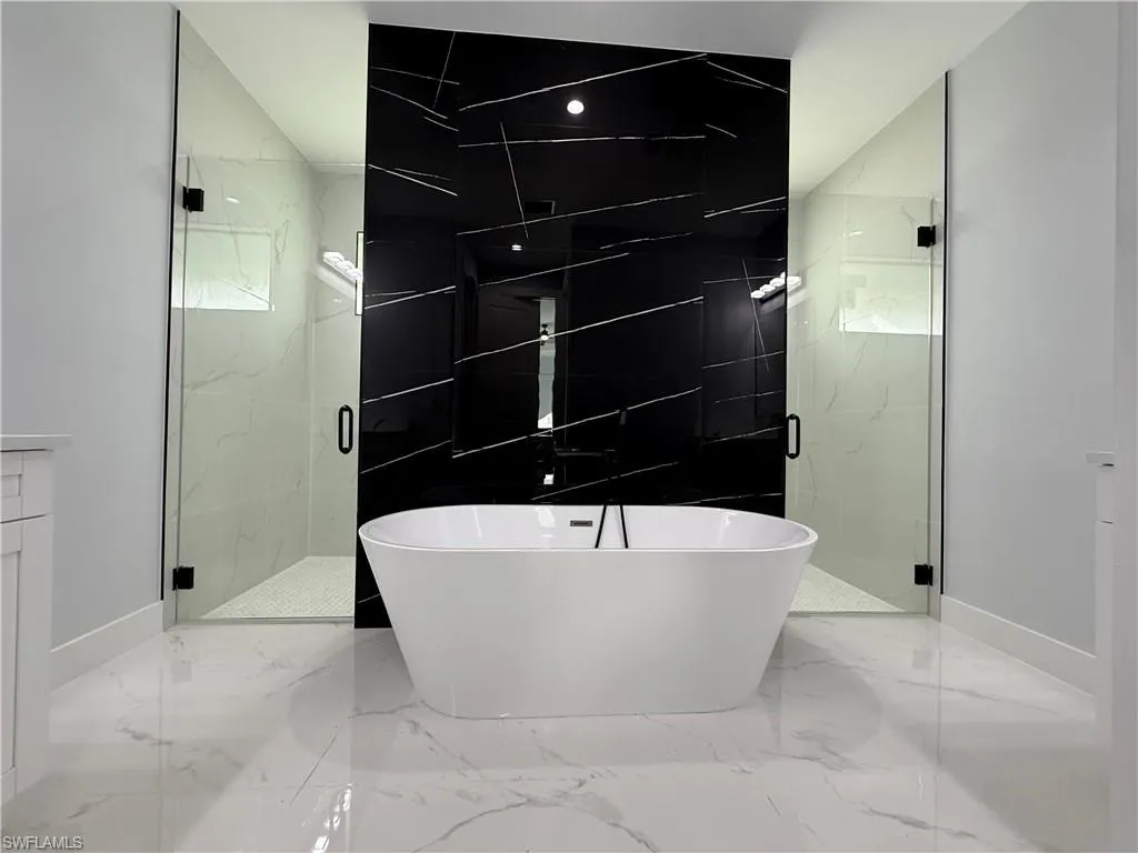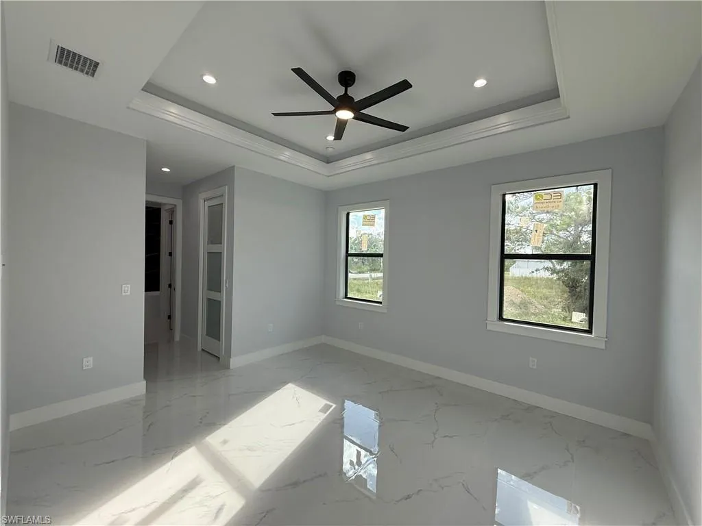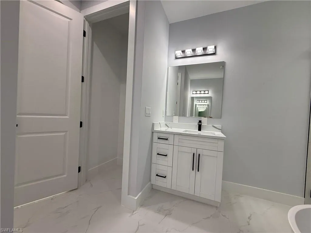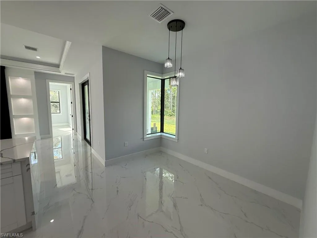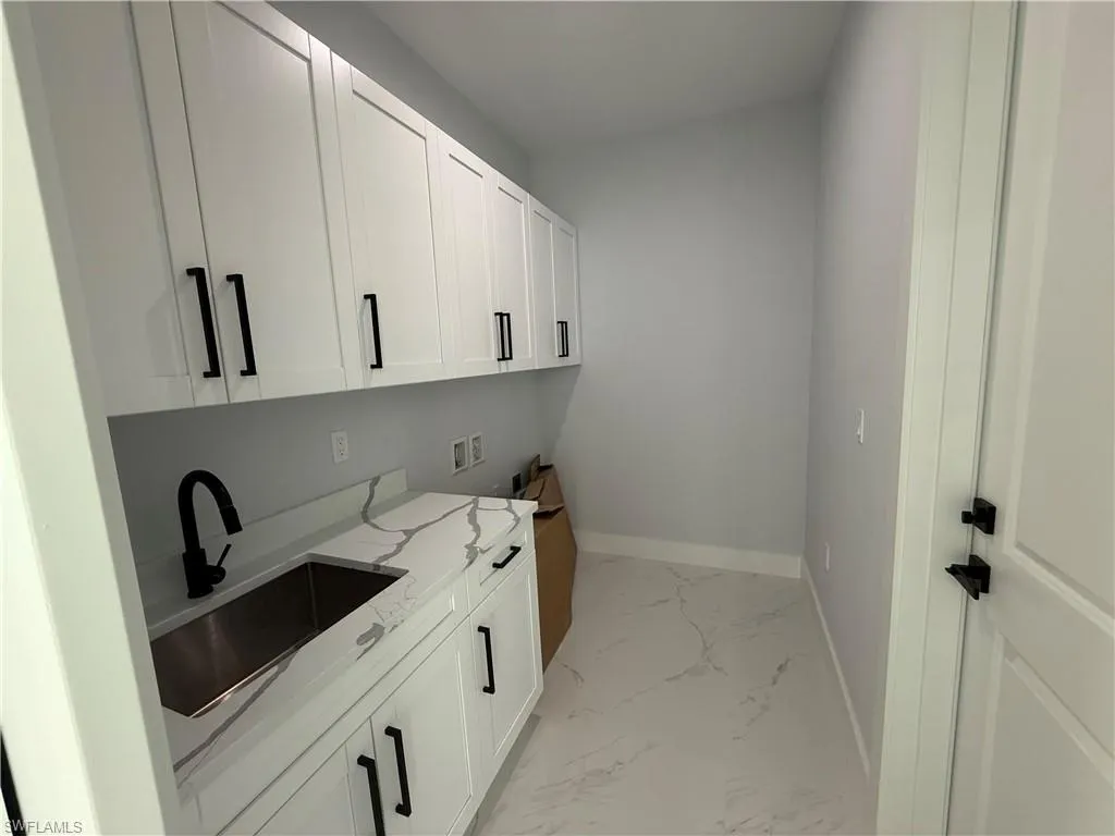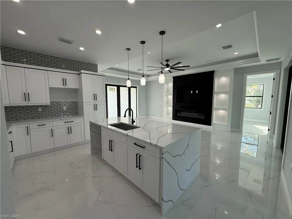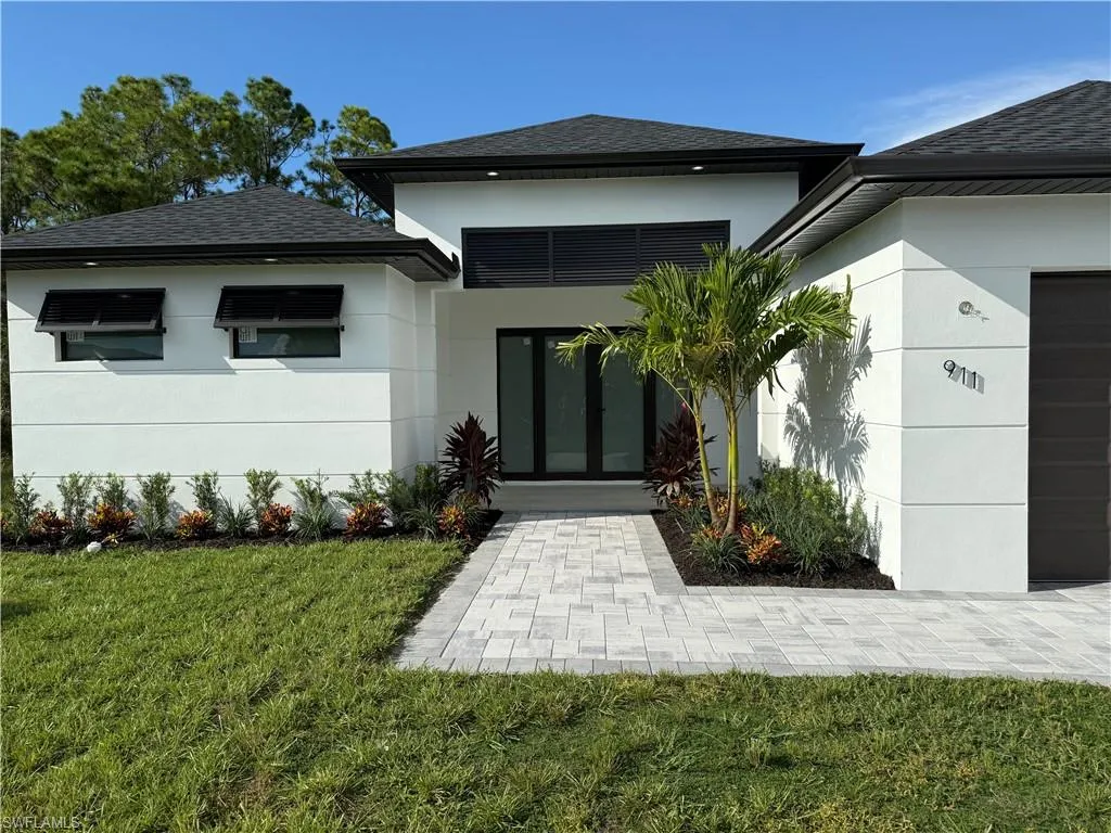 Welcome to this stunning custom-designed 3-bedrooms, 2.5 baths and a two car garage new construction home , nestled in Lehigh Acres, Florida. Elegance at its best. Featuring elegant palette white, black, serene natural brown and grey. This luxurious home is bright and welcome from the moment you walk in the front door. All rooms are spacious with plenty of natural light. Large driveway with brick pavers. Stunning frosted impact resistant glass double front door that opens to the breathtaking foyer.The spacious living room boasts soaring high tray ceiling with custom crown molding , and an electric fireplace that adds warmth and ambiance. Gourmet kitchen display exquisite lamp and spotlights, wood cabinets with soft close, quartz waterfall island with plenty of seating area and full backsplash. Dinning room featuring attractive modern chandelier and a fixed impact resistance double glass over looking the back yard.Large laundry room with soft closed wood cabinets, a sink and quartz counter top as well and 8′ custom glass door. The owner’s suite with his & her walking closets offering ample storage space for your wardrobe essentials, walkthrough tile and rainfall shower with glass door enclosed, tub with wall-mounted faucet , dual custom vanities , mirrors and quartz countertops. Epoxy garage floor. Large lanai under truss, with a half bath and a kitchen sink with granite counter top. Three zone of irrigation.This home has been meticulously crafted with 5’4″ wood base board, all impact resistance doors and windows, 8′ high doors and tile floor through out.Cover front and back porches also with tile . Don’t miss out this beauty.