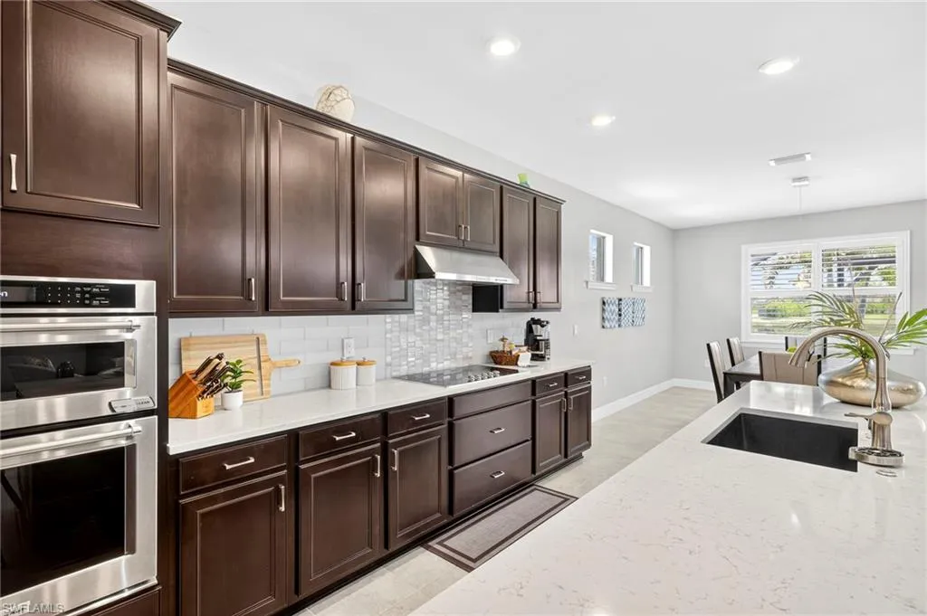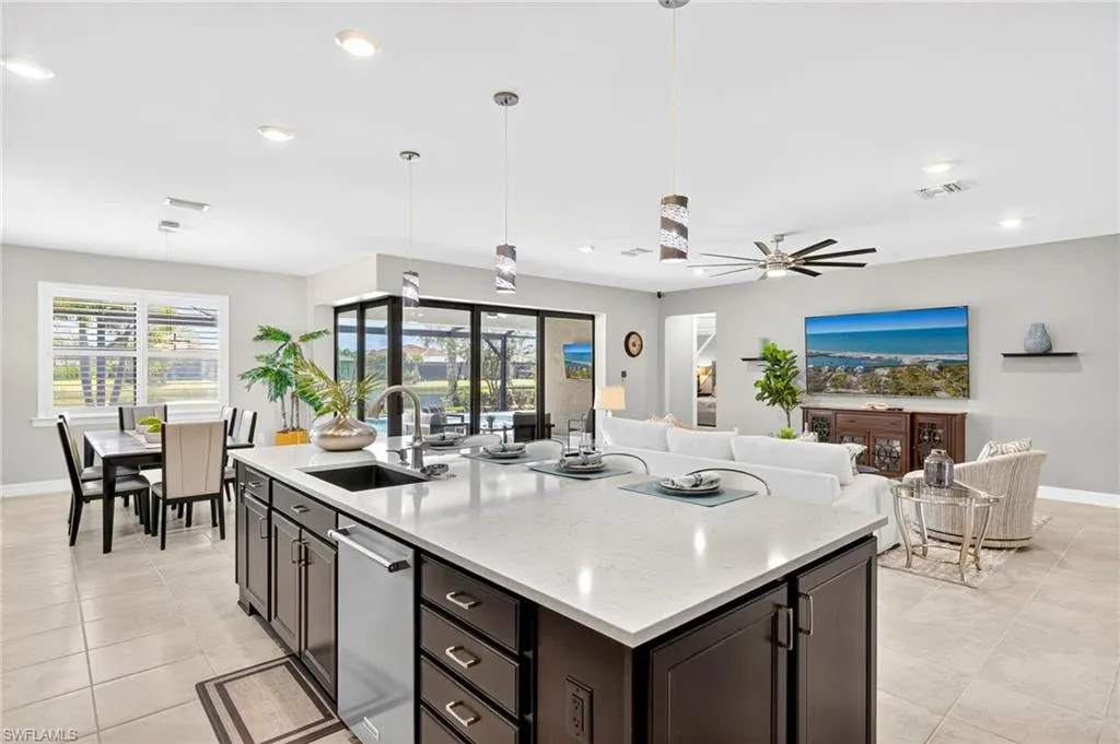 Welcome to this beautiful Pinnacle model home in the highly sought-after Bridgetown community! With over 2,400 sq ft of living space, this 4-bedroom, 3-bathroom residence (including two en-suite bedrooms) offers the perfect blend of luxury, comfort, and functionality. From the moment you arrive, you’ll notice the extended driveway and spacious 3-car garage, providing ample parking and storage. Step inside to find a bright and airy open floor plan featuring tile flooring throughout, soaring ceilings, 8-foot doors, designer barn doors, fresh interior paint, custom lighting, plantation shutters, and tons of storage space. The heart of the home is a chef’s dream kitchen—complete with an oversized island, raised-panel cabinetry, quartz countertops, wall oven, and a generous walk-in pantry. Perfect for entertaining, the kitchen flows seamlessly into the living area, where zero-corner sliders open to your extended screened lanai and heated pool, all overlooking a peaceful lake view.