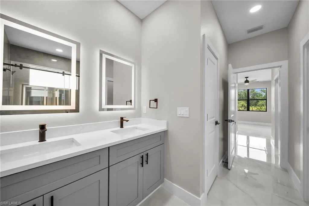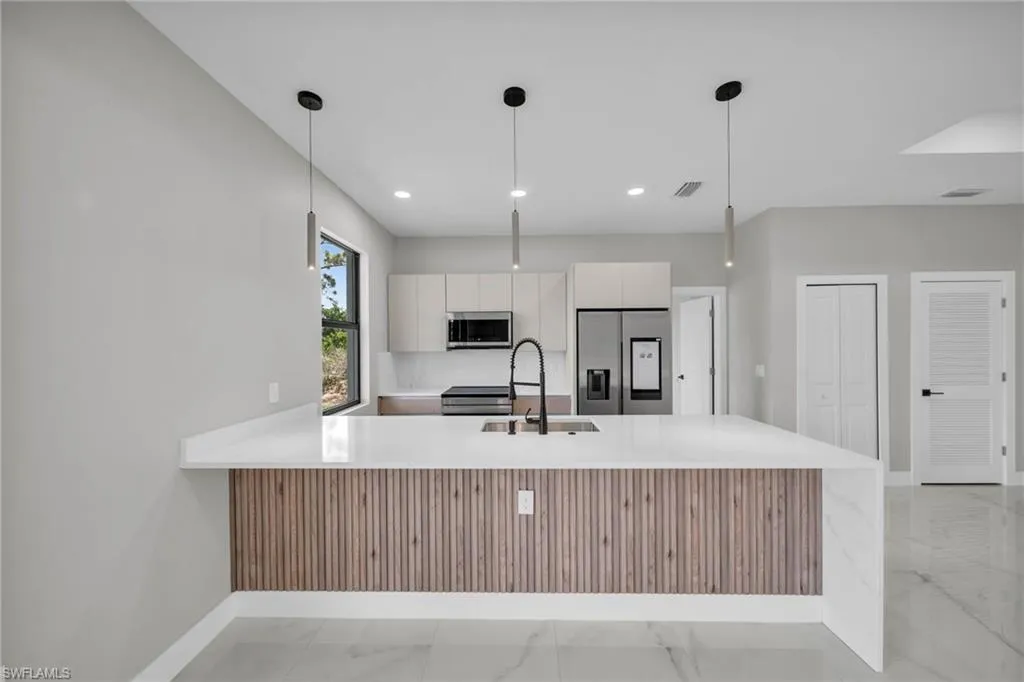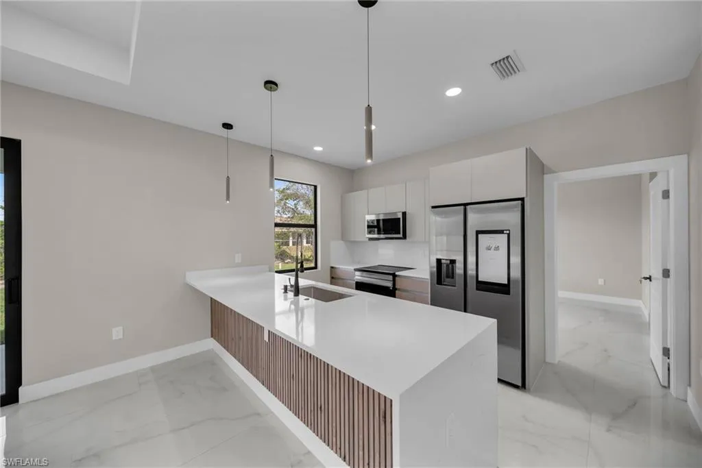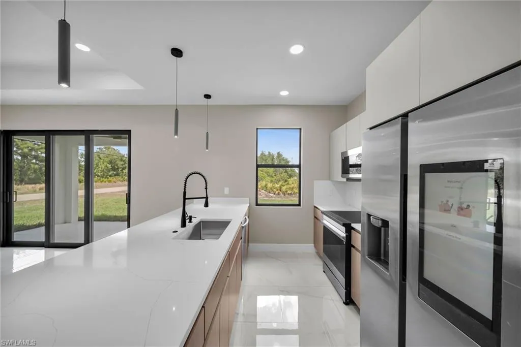 Introducing a stunning example of contemporary luxury living: this beautiful new construction boasts a modern aesthetic that is both chic and functional. Step into the spacious kitchen, featuring a sleek L island with samsung bespoke stainless steel appliances and touch screen samsung fridge and quartz countertops, perfect for cooking and entertaining. European-style kitchen cabinets provide ample storage, complementing the clean, minimalist look. Throughout the home, porcelain tile flooring adds elegance and durability. In the bathrooms, LED light mirrors combine style with practicality for a truly indulgent experience. With four bedrooms and two and a half bathrooms, including a master suite with his and hers walk-in closet and double sink and an elegant walk-in shower, comfort and luxury abound. From the floating modern vanities to the European style closet doors, every detail has been carefully curated for modern living at its finest. And with an extended lanai and sleek finishes, calling this paradise is an understatement. Automated water irrigation for grass included. Pictures are a model.