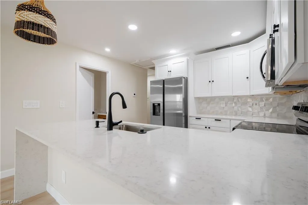 Welcome to this stunning recently remodeled 3 BR, 2 bath attached villa. This property boasts the highest-end finishes, rarely seen in properties within this price range. The moment you step inside, you will immediately appreciate the attention to detail in the kitchen, where you’ll find exquisite quartz countertops with a breakfast bar, complemented by stainless steel appliances. The kitchen’s aesthetic is elevated by a stunning backsplash and the ceiling wood beams adds a touch of elegance. This villa also offers the convenience of a stackable washer and dryer. The master bedroom showcases the contemporary appeal of barn doors, which add a unique and stylish touch. In addition, the master bedroom features a custom closet, providing ample storage space for your belongings. You will love the two private courtyards that offer the opportunity for you to create your own personal oasis. Lastly for your peace of mind this beautiful unit have all high impact windows! Conveniently located near the community amenities, including two swimming pools, tennis courts, a clubhouse, shuffleboard, and basketball Take leisurely strolls around the neighborhood’s serene lakes. One of the standout features of this community is its pet-friendly atmosphere, allowing you to bring your furry companions along on your new journey.The location of this neighborhood is highly convenient, with its proximity to FGCU (Florida Gulf Coast University), Gulf Coast Town Center, Miromar Outlets, and Coconut Point. Additionally, you’ll find that the beautiful beaches of the area are just a short distance away.